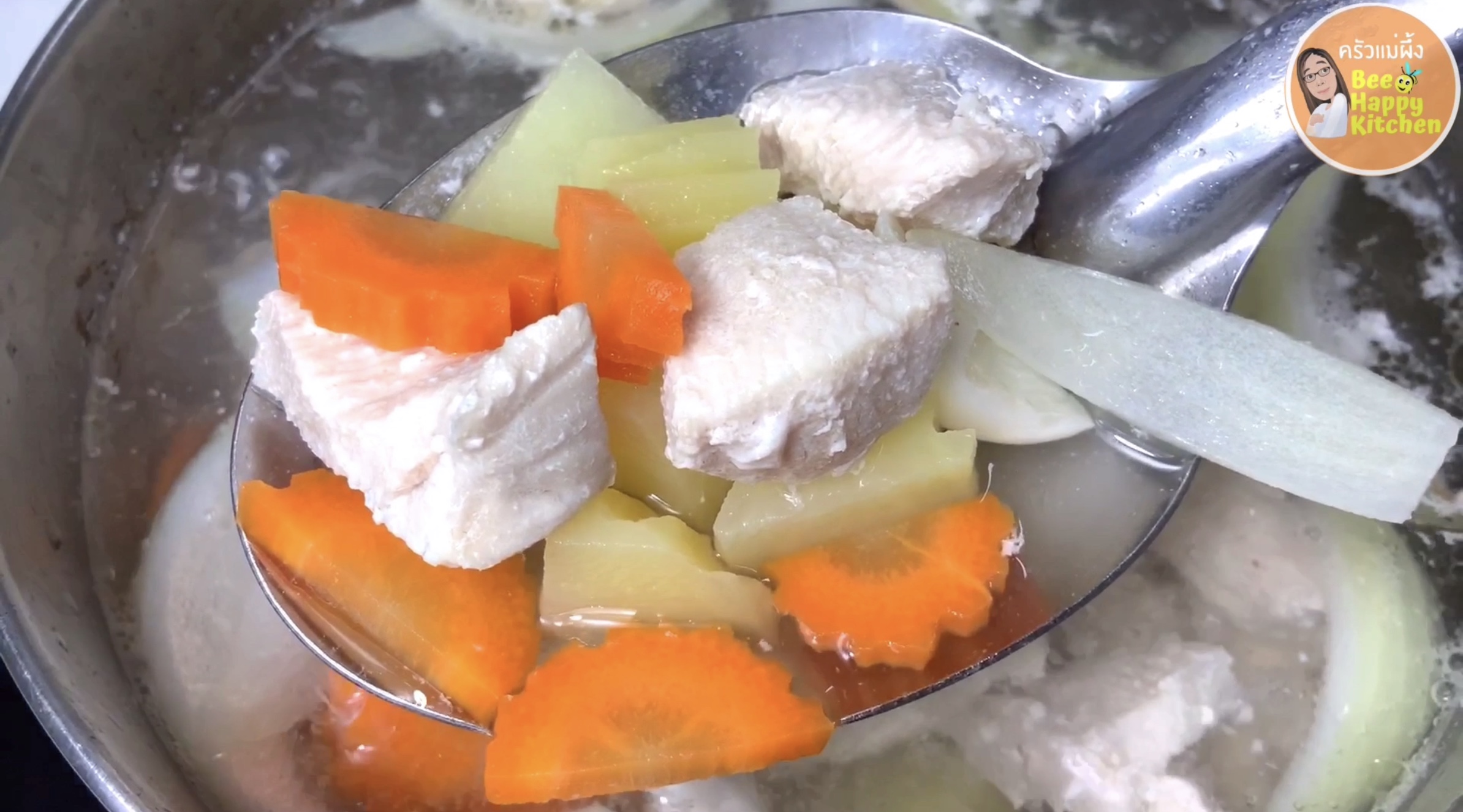 เมื่อน้ำซุปเดือดใส่ผัก มันฝรั่ง แครอท และหอมใหญ่ลงไปก่อน ปรุงรสเพิ่มด้วยซีอิ๊วขาว 1-2 ชต นำมันหอย 1 ชต