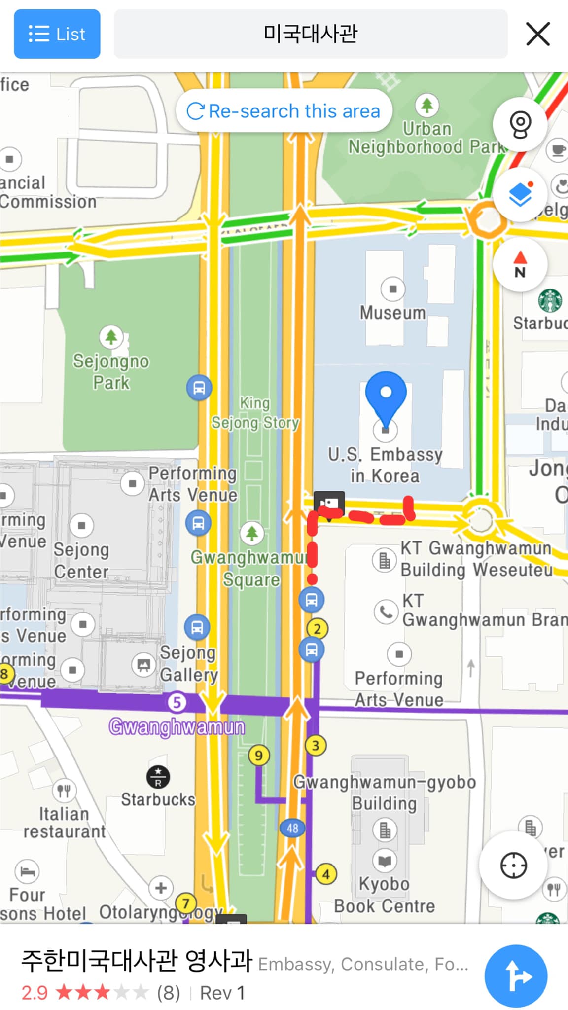 เราเลือกเวลาไว้ตอน 8 โมงครึ่ง แต่ไปถึงสถานทูตตอน 7โมงครึ่ง (ตื่นเต้น เพราะกลัวไปผิด 55) สถานทูตเมกาอยู่ใกล้กับพระราชวังคยองบุกกุง ถ้าไปรถไฟใต้ดินให้ขึ้นสายสีม่วง(หมายเลข5) ไปลงสถานี กวังฮวามุน (광화문역) แล้วไปออกที่ทางออกหมายเลข 2 เดินตรงไปต่ออีกนิดเดียว จะเจอสถานทูตอยู่ขวามือ เราเห็นมีประตูทางเข้าด้านหน้าก็เลยลองไปผลักๆ ดู เอ้า เปิดไม่ได้ สักพักมีคุณ รปภ. ของสถานทูตชาวเกาหลีแกบอก ‘이쪽 아닙니다!! ‘(ไม่ใช่ทางนี้ครับ!!) เราก็เหวอ คนเกาหลีอีกสองสามคนที่กำลังจะเดินตามเราเข้าไปต่างก็เหวอกันหมด 55 สุดท้ายคุณลุงแกก็บอกว่า ให้เดินเข้าซอยเลียบกำแพงของสถานทูตไปจะเจอทางเข้า เรากับคนเกาหลีก็เดินๆ ไปตามที่แกบอก เลียบกำแพงเข้าไปไม่ถึง 100เมตรก็เจอทางเข้า ที่มีคนมาต่อคิวรออยู่แล้วประมาณ 10 กว่าคน เราก็เดินไปต่อคิวกับเค้า