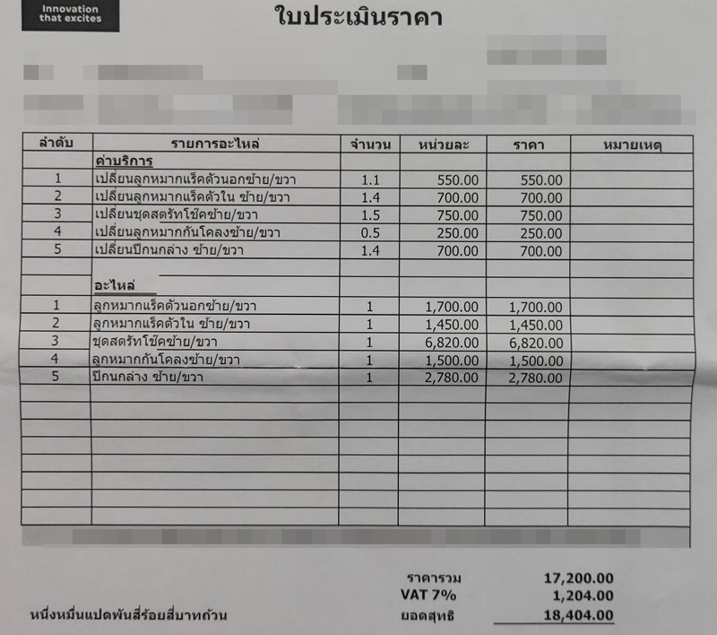คือผมมีแพลนว่าจะซ่อมช่วงล่างรถ Tiida 1.6 5Doors ปี 2006 ครับ อาการคือเวลาขึ้นลงเนินสะดุดหรือวิ่งบนถนนที่ไม่เรียบแล้วมีเสียงดังกึกกักและมีอาการโช้คหลังรั่ว ลองให้ทางศูนย์ประเมินราคาให้แล้วได้มาตามรูปข้างล่างนี้ ซึ่งราคาก็ค่อนข้างแรง 555 เลยคิดว่าถ้าสั่งอะไหล่มาเองแล้วหาอู่ข้างนอกทำให้น่าจะถูกกว่าพอสมควร