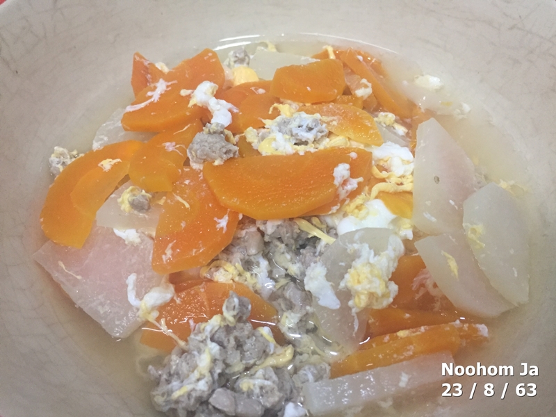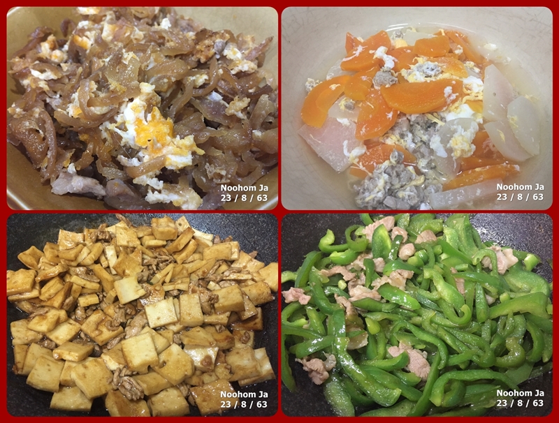 วันอาทิตย์ที่ 23 สิงหาคม พ.ศ. 2563 เชียงใหม่ฝนตกบางแห่งมีน้ำท่วมขังยังต้องระวังน้ำป่าไหลหลาก เพื่อนหลายท่านอยู่กับบ้านในวันหยุด สุขทุกข์ต่างกันไป แนะนำเมนูอาหารเช้านี้ ผัดหัวไชโป้วใส่ไข่ หวานๆเค็มๆมันๆ..ต้มซุปไข่น้ำ ไว้ซดกันเส้นหัวผักกาดติดคอ..ผัดพริกหวาน เขียวใส่หมู..ผัดเต้าหู้ใส่เต้าเจี้ยว..ของฝากเต้าเจี้ยวหลน หนักไปทางผัดๆตามวัตถุดิบที่พอจะมีหลงเหลือติดบ้าน