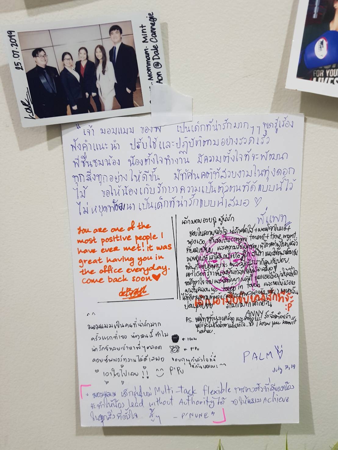 เปิดตัวมาสวยตลอดกับการทำงานที่นี่ และตบท้ายกับความสุขที่รู้สึกปลื้มปริ่มและตื้นตันกับ 1 ชม. สุดท้ายหลังการกินเลี้ยงที่ Goji พี่ๆทุกคนในทีมก็จะพูดถึงน้องแต่ละคนคนละ 2-3 นาทีถึงความในใจความรู้สึกที่เขามีต่อน้องแต่ละคนนั้นๆ เป็นช่วงเวลาที่ค่อนข้างใช้เวลามาก แต่เรากลับรู้สึกว่ามันผ่านไปเร็ว เพราะการกระทำทั้งหมดนั้นมันมาจากความจริงใจ เราฟังและรับความรู้สึกของเขา ยิ้มไปจนแก้มปริ พระหลังจากจบพัดของเราเราก็จะพูดถึงทุกคนรวมๆ ทีละคน ส่วนแมมเองก็แอบทำการ์ดเขียนถึงแต่ละคน มอบให้เป็นของขวัญทำมือเนื่องในโอกาสจากลานี้
