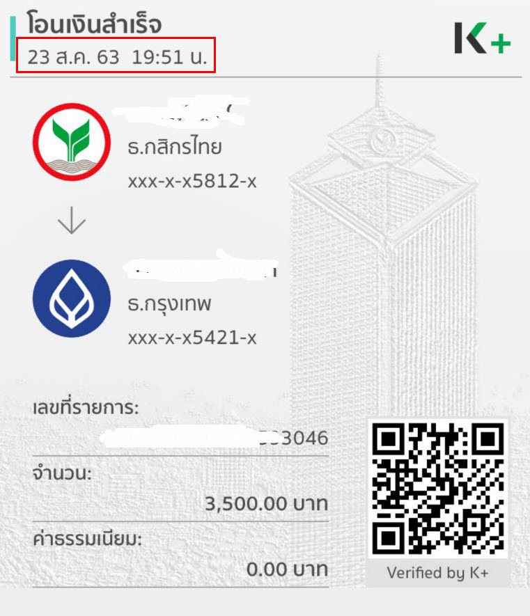 เมื่อเวลา 19:51 น. เราได้ใช้ K Plus เพื่อโอนเงิน 3,500 ไปยัง บ/ช. ปลายทาง BBL ปรากฎว่าเราเลือกสินค้า เรียบร้อยจะชำระเงิน