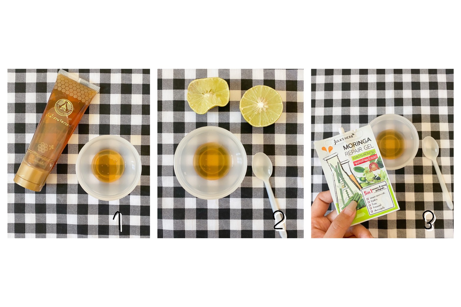 ขั้นตอนที่2 บีบมะนาวผสมกับน้ำผึ้ง โดยให้มะนาวมีอัตราส่วนที่น้อยกว่าน้ำผึ้ง มะนาวจะช่วยเรื่องรอยช้ำ