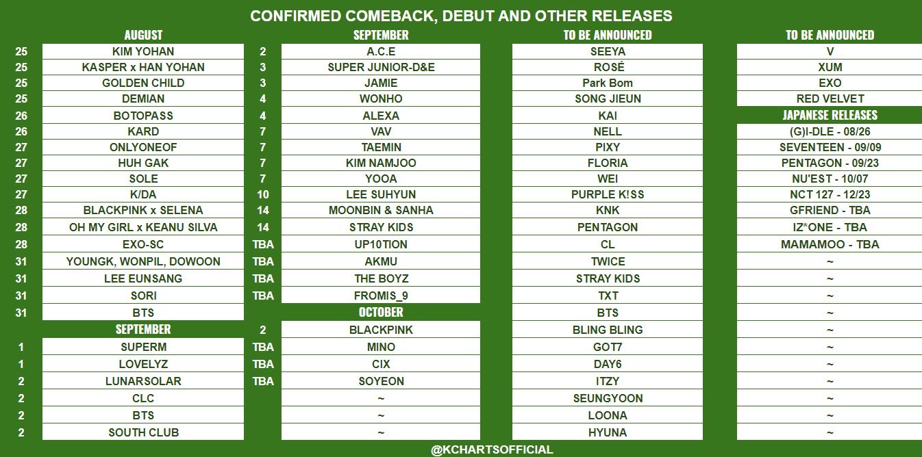อัพเดตตารางคอนเฟิร์ม คัมแบค/เดบิวต์/ปล่อยเพลง ของศิลปิน K-pop ล่าสุด!