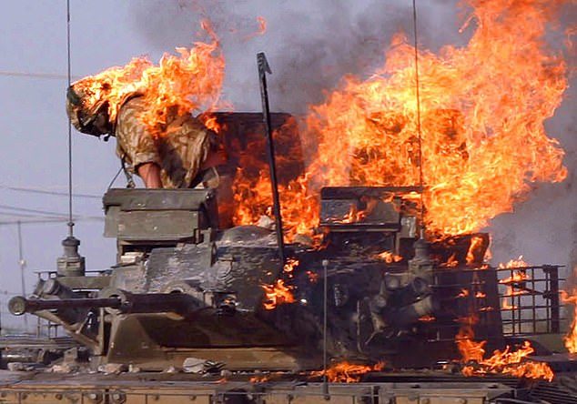ทหารอังกฤษหนีออกจากรถถังวอร์ริเออร์ที่ถูกยิงในสงครามอิรัก