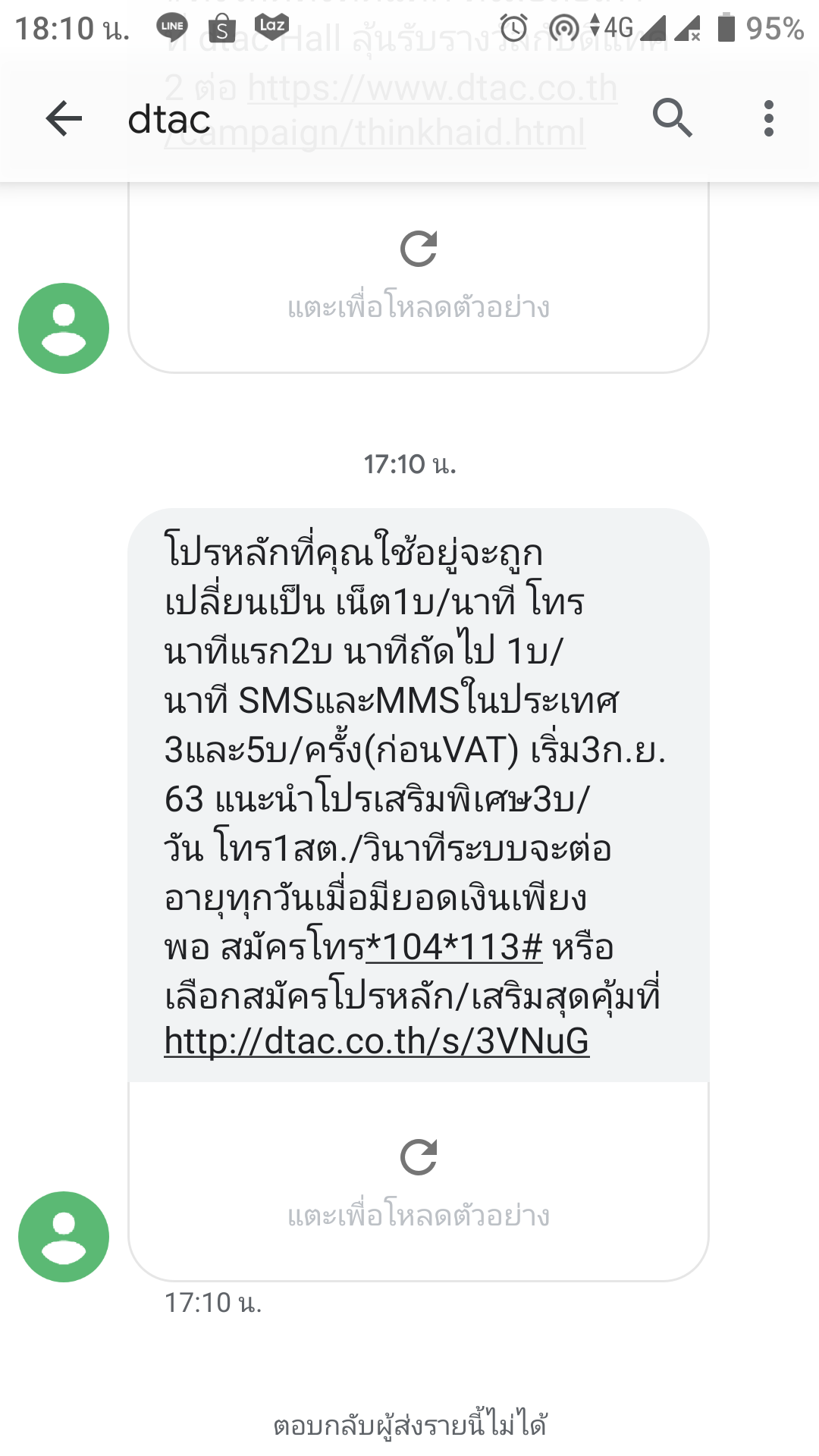 "โปรหลักที่คุณใช้อยู่จะถูกเปลี่ยนเป็น เน็ต1บ/นาที โทรนาทีแรก2บ นาทีถัดไป 1บ/นาที SMSและMMSในประเทศ 3และ5บ/ครั้ง(ก่อนVAT) เริ่ม3ก.ย.63 แนะนำโปรเสริมพิเศษ3บ/วัน โทร1สต./วินาทีระบบจะต่ออายุทุกวันเมื่อมียอดเงินเพียงพอ สมัครโทร*104*113# หรือเลือกสมัครโปรหลัก/เสริมสุดคุ้มที่ http://dtac.co.th/s/3VNuG"