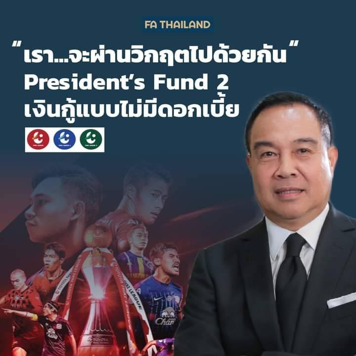 ในการนี้ พล.ต.อ.ดร.สมยศ พุ่มพันธุ์ม่วง นายกสมาคมฯ ได้ตระหนักเป็นอย่างดีถึงความเดือดร้อนของสโมสรสมาชิก และมีความต้องการที่จะช่วยเหลือให้สโมสรสมาชิกผ่านห้วงเวลาแห่งความยากลำบากนี้ไปด้วยกัน จึงดำริใช้เงินของครอบครัว จัดให้มีโครงการเงินกู้แบบไม่มีดอกเบี้ย President’s Fund 2 สำหรับสโมสรสมาชิกนำไปใช้ในการบริหารจัดการทีมในช่วงวิกฤตนี้ เพื่อร่วมกันประคับประคองฟุตบอลไทยทั้งระบบให้ก้าวข้ามช่วงเวลาที่ยากลำบากไปด้วยกัน โดยการชำระหนี้ จะเป็นในรูปแบบของการหักออกจากเงินสนับสนุนในฤดูกาล 2564