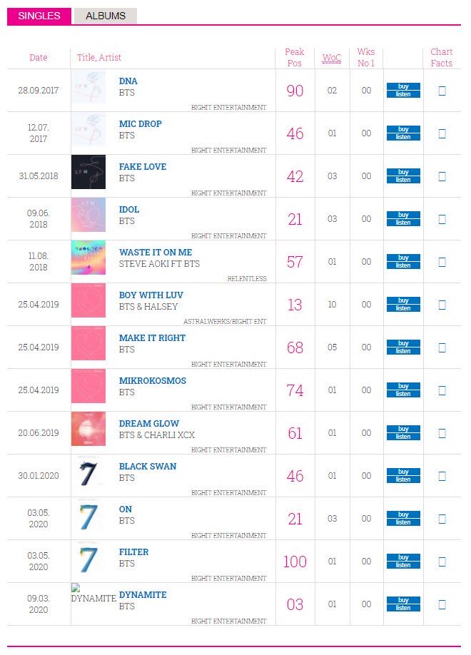 นับเป็นครั้งแรกของศิลปินกลุ่มเกาหลีที่ติดอันดับ TOP 5 บน UK singles chart และเพลง Dynamite ติดอันดับ3 ด้วยยอดขาย 50.2 K, ยอดสตรีม 5.3 ล้าน และ 22K download