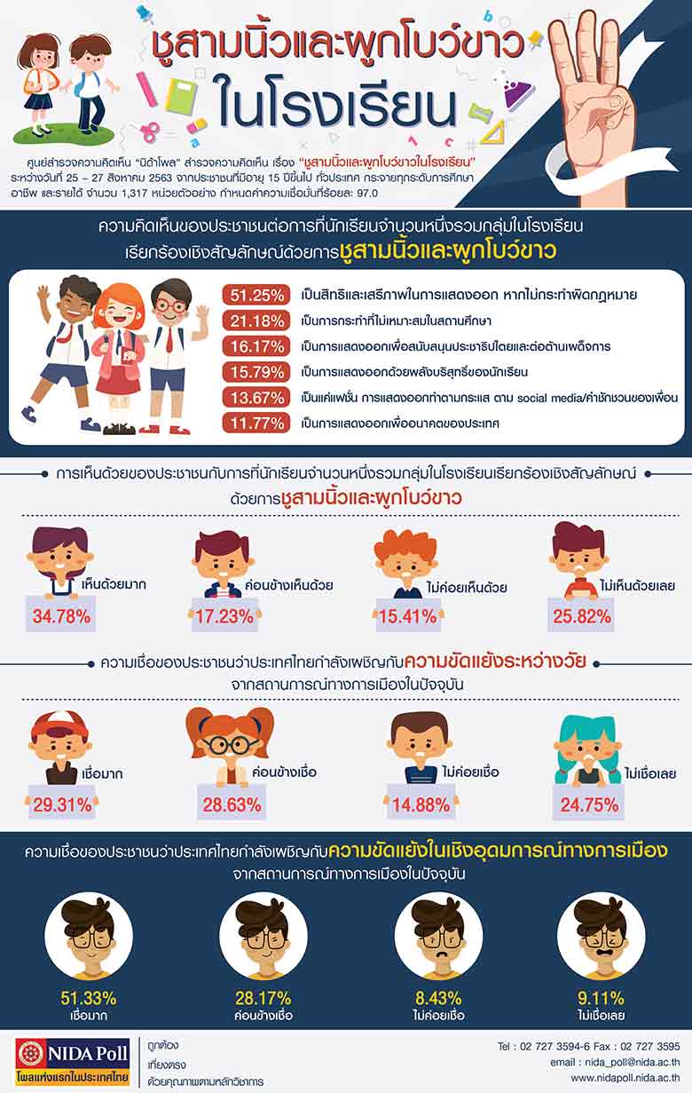 “นิด้าโพล” สถาบันบัณฑิตพัฒนบริหารศาสตร์ (นิด้า) เผยผลสำรวจความคิดเห็นประชาชนทั่วประเทศ จำนวน 1,317 หน่วยตัวอย่าง เรื่อง “ชูสามนิ้วและผูกโบว์ขาวในโรงเรียน” ทำการสำรวจระหว่างวันที่ 25 – 27 สิงหาคม 2563 เมื่อถามถึงความคิดเห็นของประชาชนต่อการที่นักเรียนจำนวนหนึ่งรวมกลุ่มในโรงเรียนเรียกร้องเชิงสัญลักษณ์ด้วยการชูสามนิ้วและผูกโบว์ขาว พบว่า