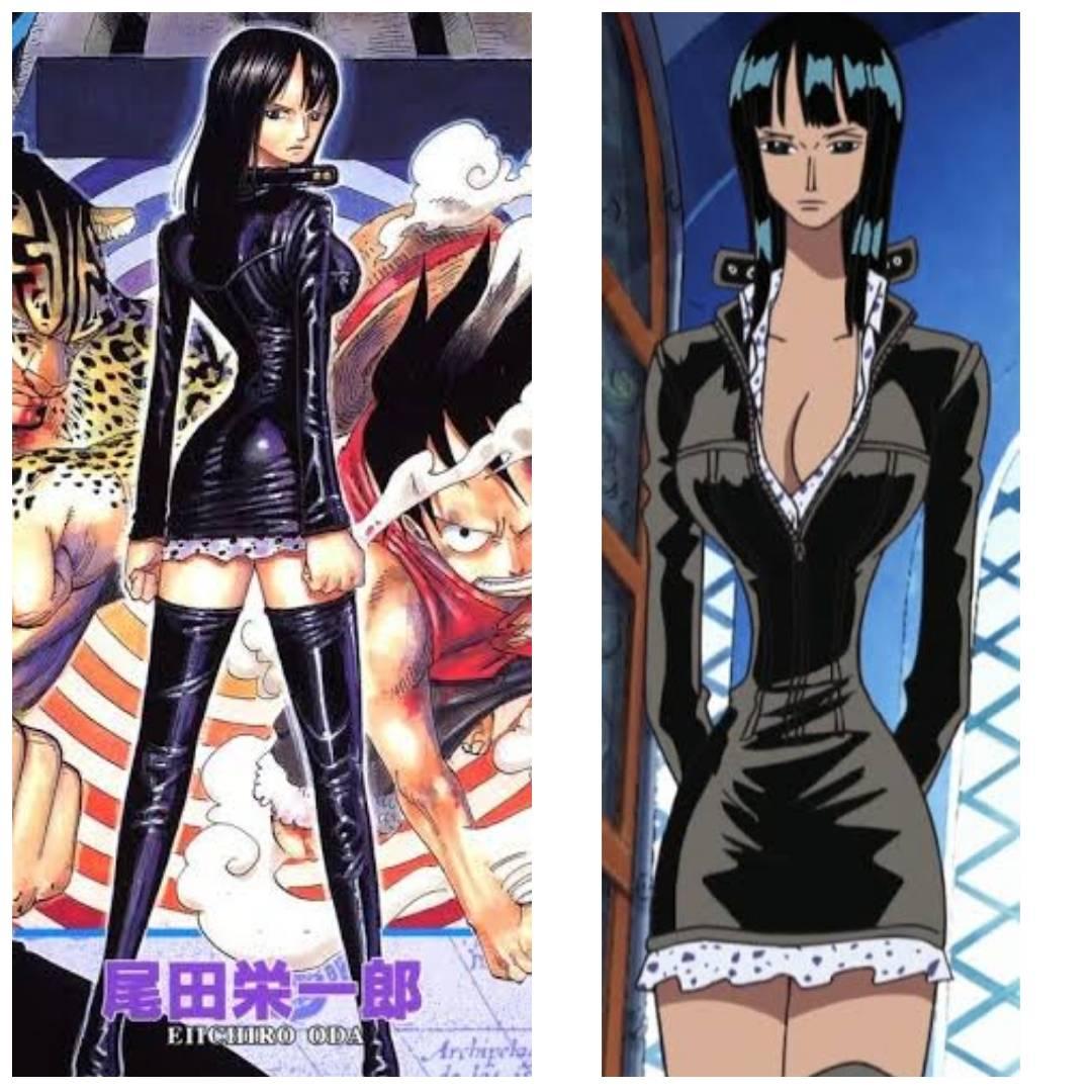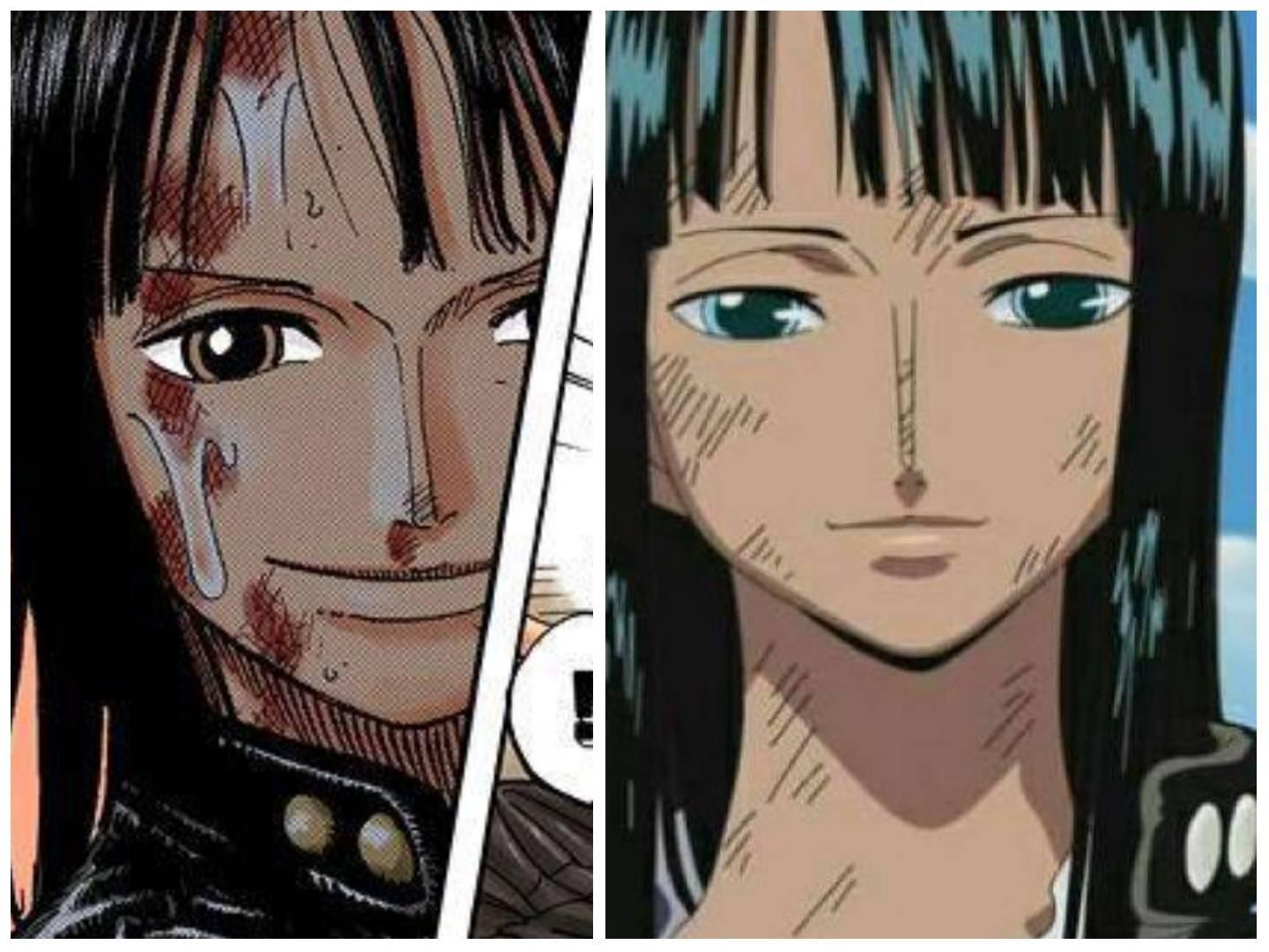 จะเห็นว่าในมังงะ โรบินจะตาสีน้ำตาล ส่วนอนิเม สีเขียว แถมในช่วงก่อนไทม์สคริป สีผิวโรบินในอนิเมคล้ำกว่าด้วย แต่หลังจากไทม์สคริปในอนิเมก็ปรับให้เธอผิวขาวขึ้นเป็นปกติ