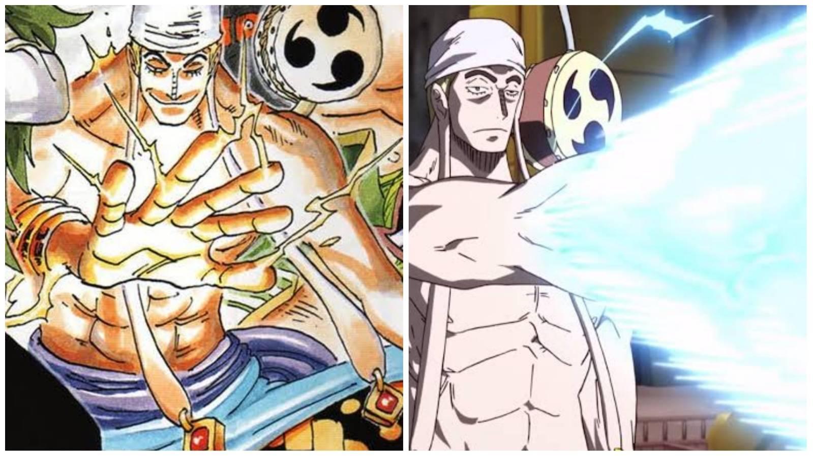 ในมังงะเอเนลมีพลังสายฟ้าเป็นสีเหลืองแหละ (Official Digital Colored) แต่ในอนิเมถูกปรับให้เป็นสีฟ้า ซึ่งเข้ากับธีมและชุดมากกว่า อันนี้ผมชอบอนิเมนะ สีดูไฟฟ้ากว่าจริงๆ แหละ