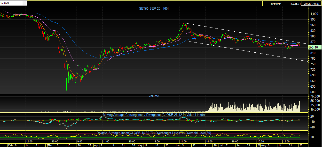 S50U20 TF 60Min: ตลอดหลายวันที่ผ่านมา ดัชนียังคงเคลื่อนไหว ในลักษณะ Sideways Down ภายในกรอบ “Downtrend Channel” แม้ว่าจะมีความพยายามขึ้นไปทดสอบ แนวต้านด้านบน แต่ท้ายที่สุด ก็ไม่สามารถผ่านขึ้นไปได้ เผชิญแรงเทขาย และย่อตัวลงมาในที่สุด ซึ่งในลักษณะนี้ เป็นการฟื้นตัวที่ทำ High ต่ำลงจากก่อนหน้า และ การย่อตัวลงได้สร้าง Low ที่ลึกกว่าก่อนหน้า หรือที่เรียกว่า Lower High “LH” ซึ่งมองว่าแนวโน้มถัดจากนี้ ดัชนีน่าจะค่อยๆร่วงลงมาต่อ โดยมองแนวรับไว้ที่บริเวณ 831 จุด ถ้าหากรับอยู่ ก็มีโอกาสฟื้นตัว แต่ถ้าหลุดร่วงลงมา ก็ระวังอาจเกิดการพักฐาน ตามมา ก็เป็นได้