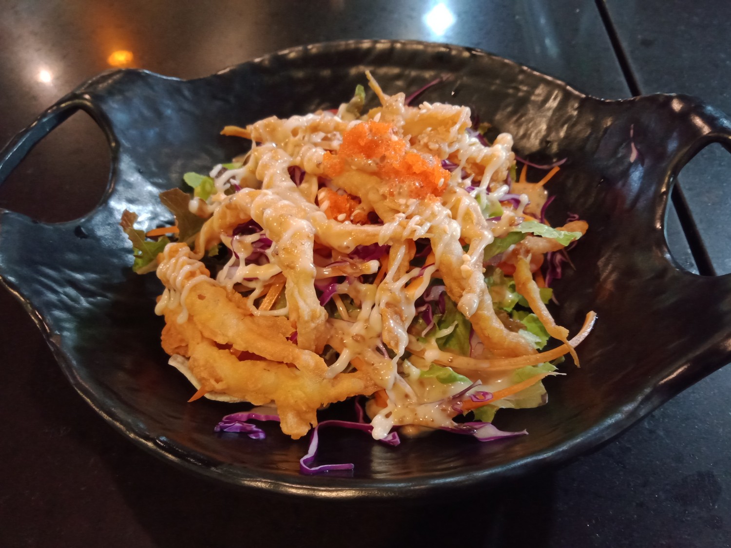 สลัดปลาเงินกรอบ ปลาทอดกรอบกำลังดี ตัวใหญ่เคี้ยวเพลินฟัน ผักสดใช้ได้ น้ำซอสรสเปรี้ยวอ่อนๆ พอถูไถ
