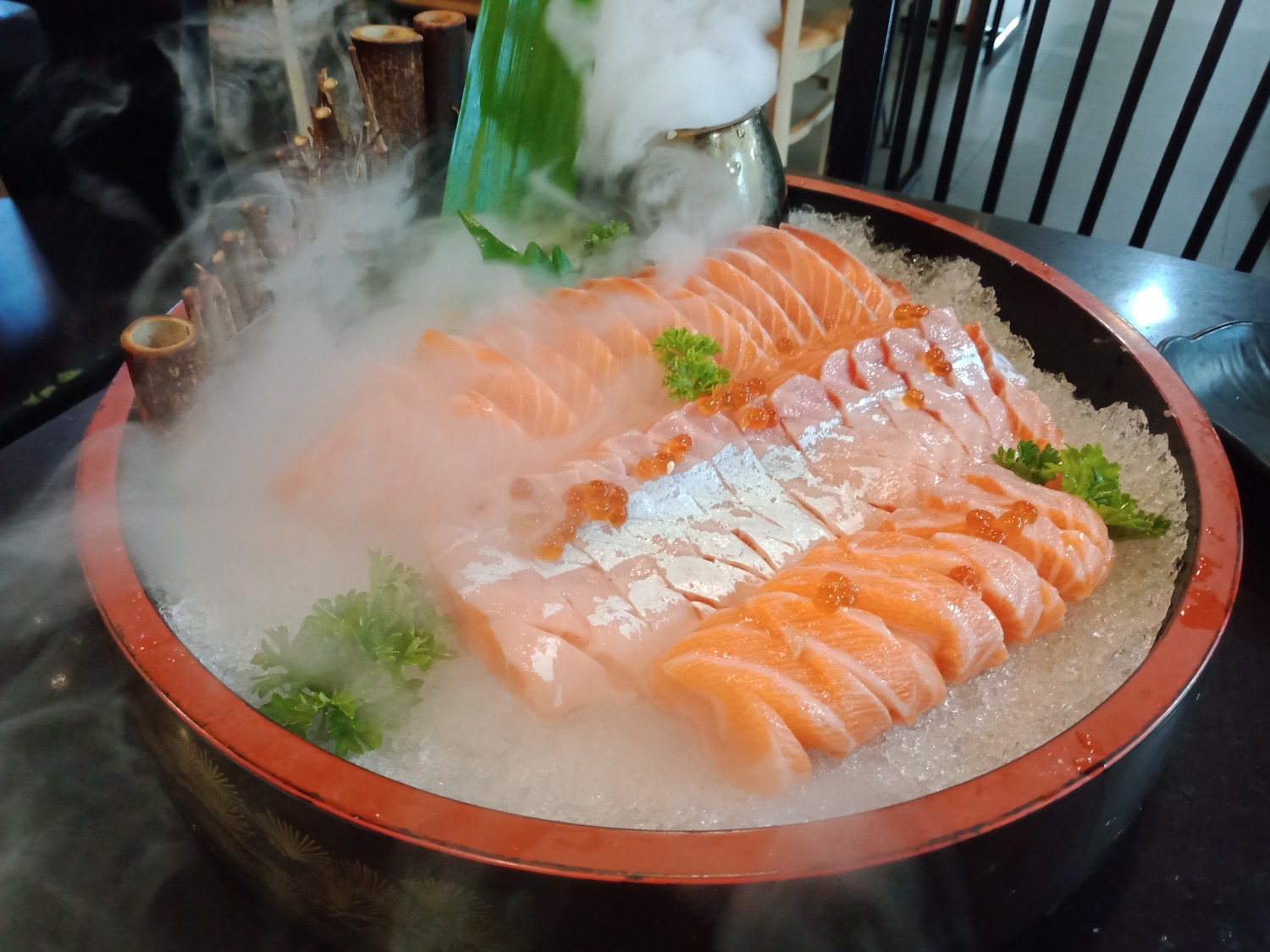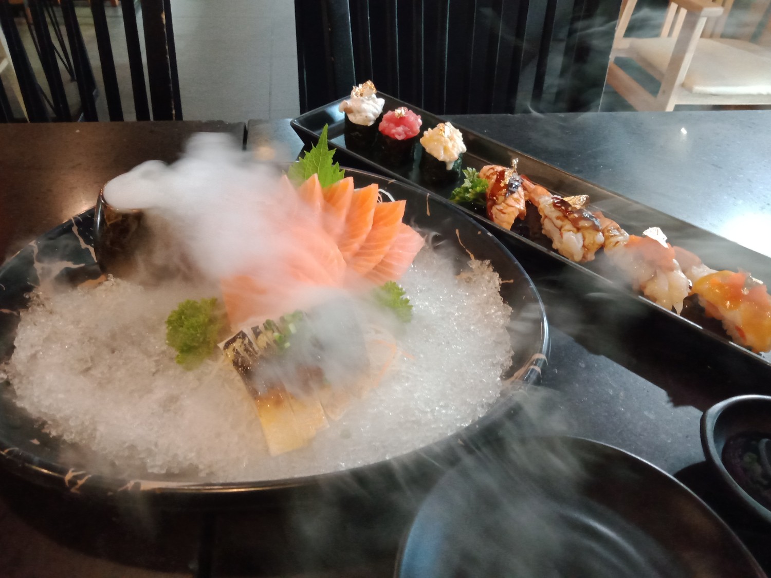 เหล่าปลาดิบและข้าวปั้นหน้าแพงๆทั้งหลาย เสิร์ฟมาพร้อมน้ำแข็งแห้ง ควันฉุยเลย