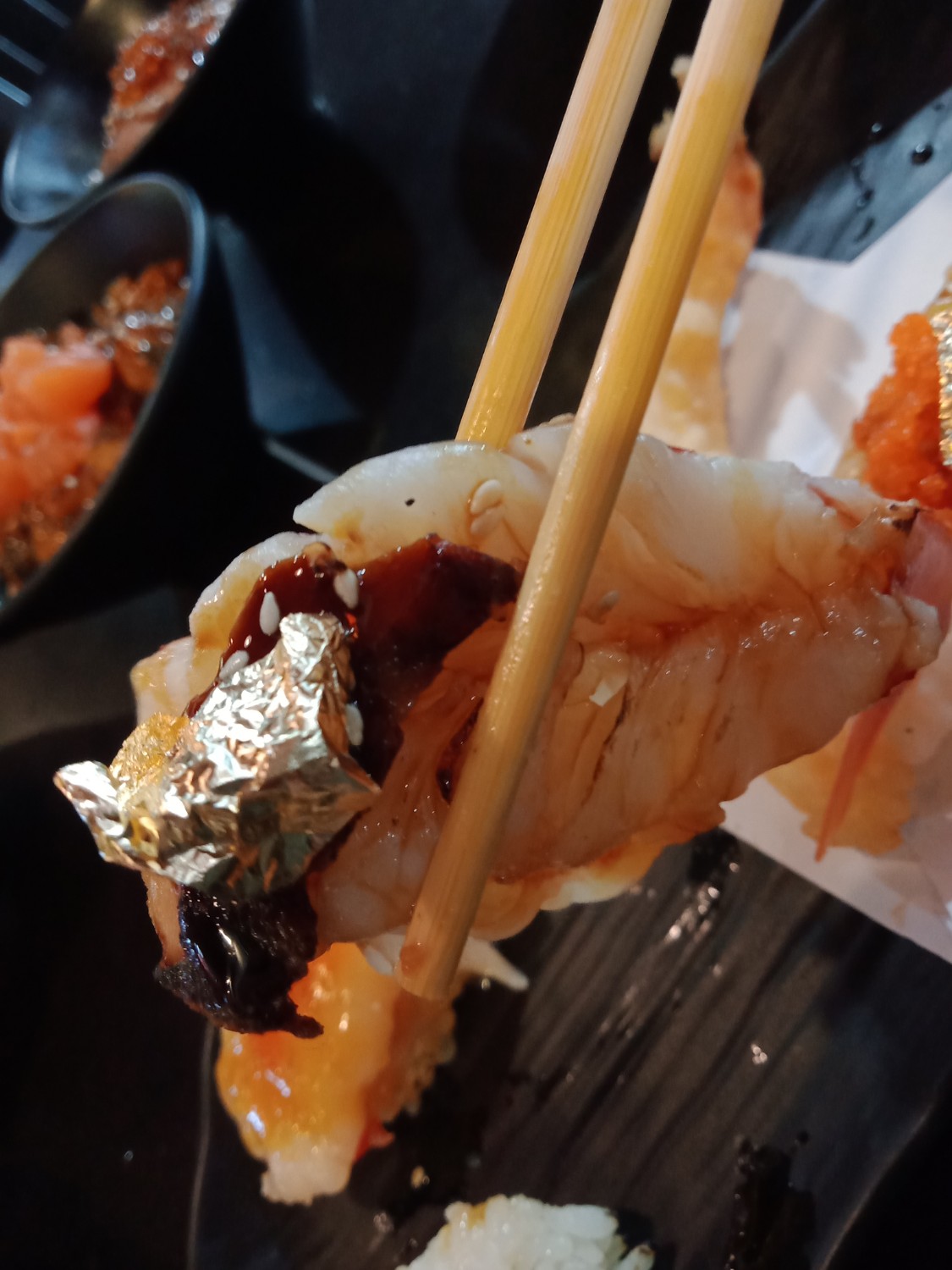 เพราะมันมีปลาไหล ฟัวกรา(ท็อปบนข้าวปั้น) แล้วก็เมนูพรีเมี่ยมพวกสเต็กเนื้อย่าง กุ้งย่างให้กินอีกด้วย มางวดนี้เน้น