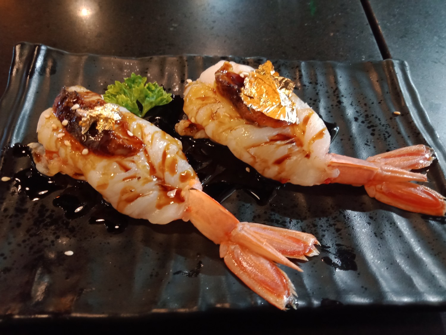 ข้าวปั้นแบบกุนกันก็มีโปะแผ่นทองด้วยนะ สั่งมาลองสามอย่าง คือ กุ้งยักษ์สับกับซอสวาซาบิมายองเนส เนื้อกรึบเหนียว ซอสครีมหวานฉุน พอใช้