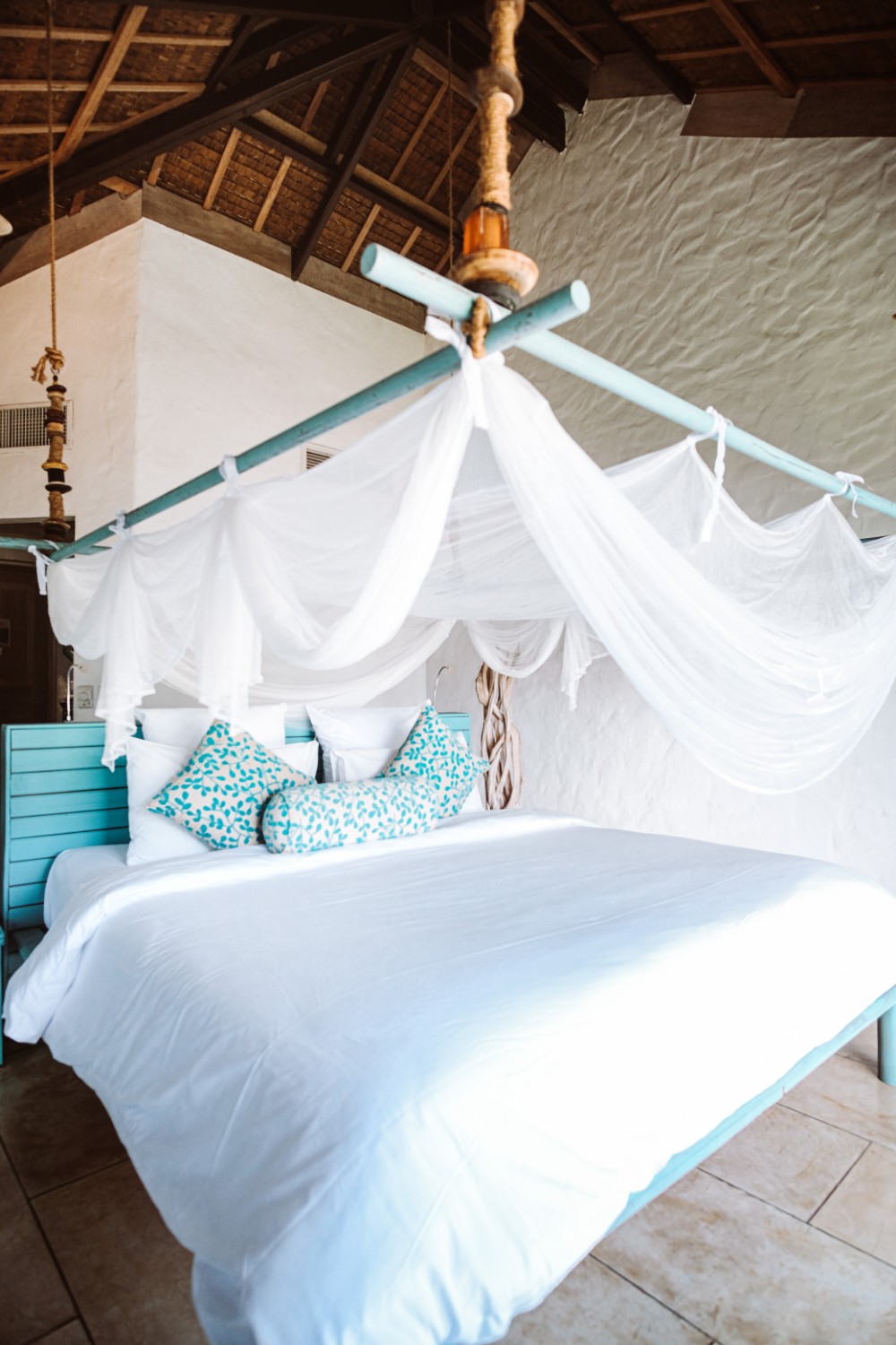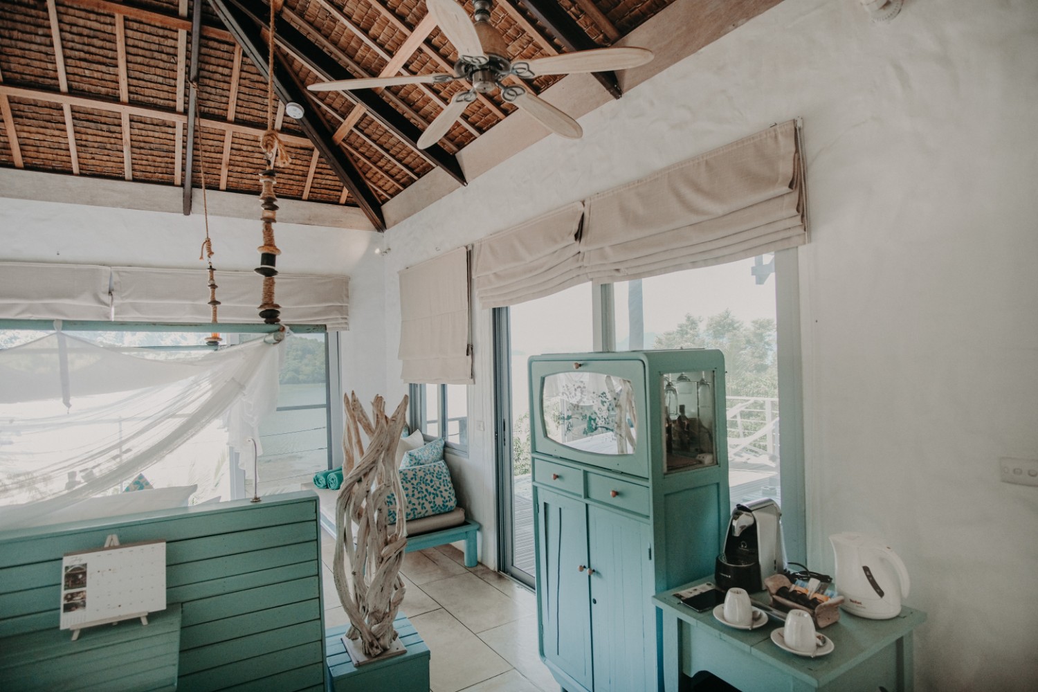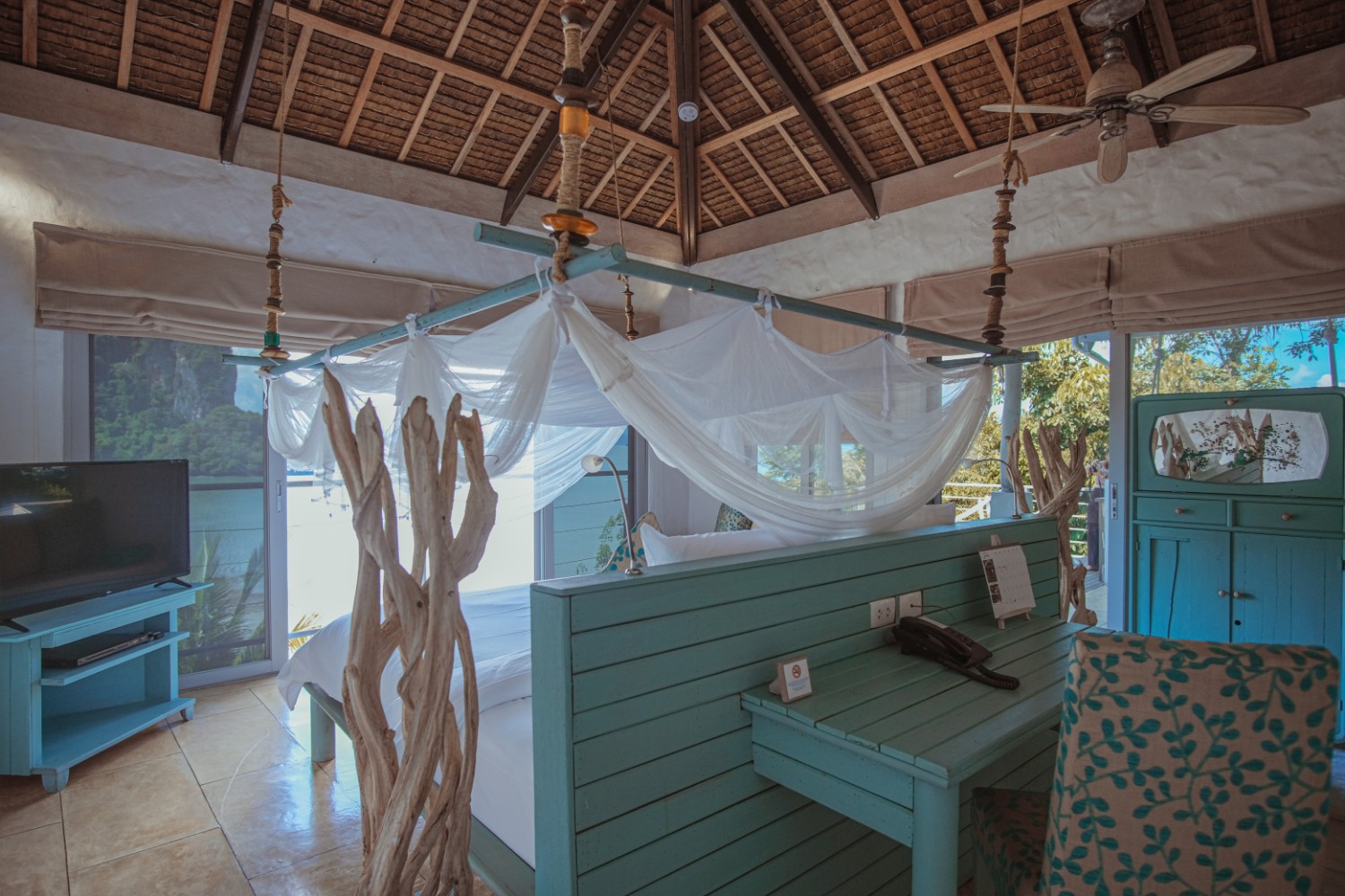 ตัวห้องพักทุกหลังจะตกแต่งด้วยโทนสีขาวและฟ้าเป็นหลัก สบายตาไม่แย่งซีนธรรมชาติ มีเตียงขนาดใหญ่อยู่กลางห้อง