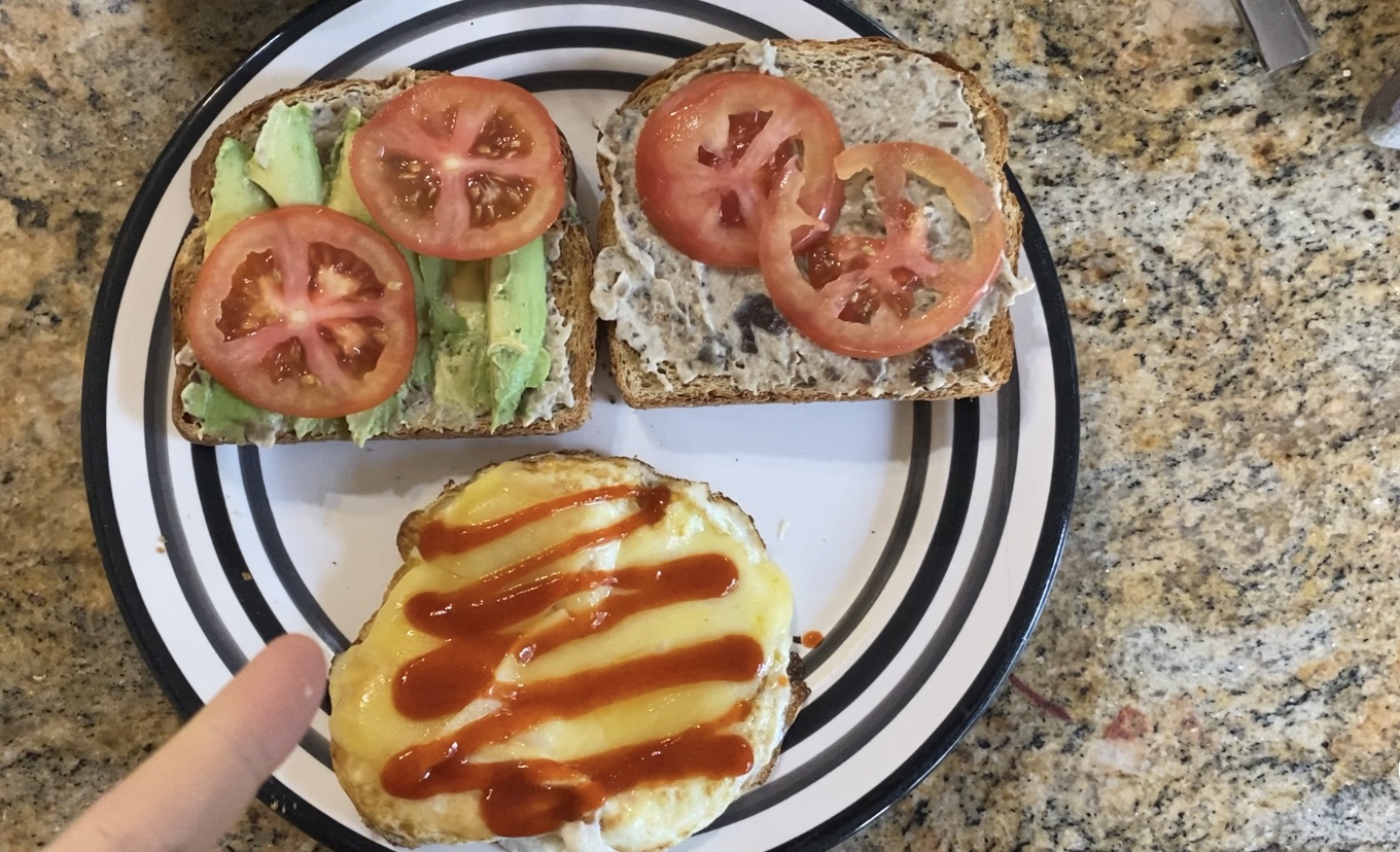 ข้าวเช้า ไข่ดาว 2 ฟอง โปะชีสซะหน่อย ของชอบ กินกับขนมปังทาครีมมะเขือม่วง