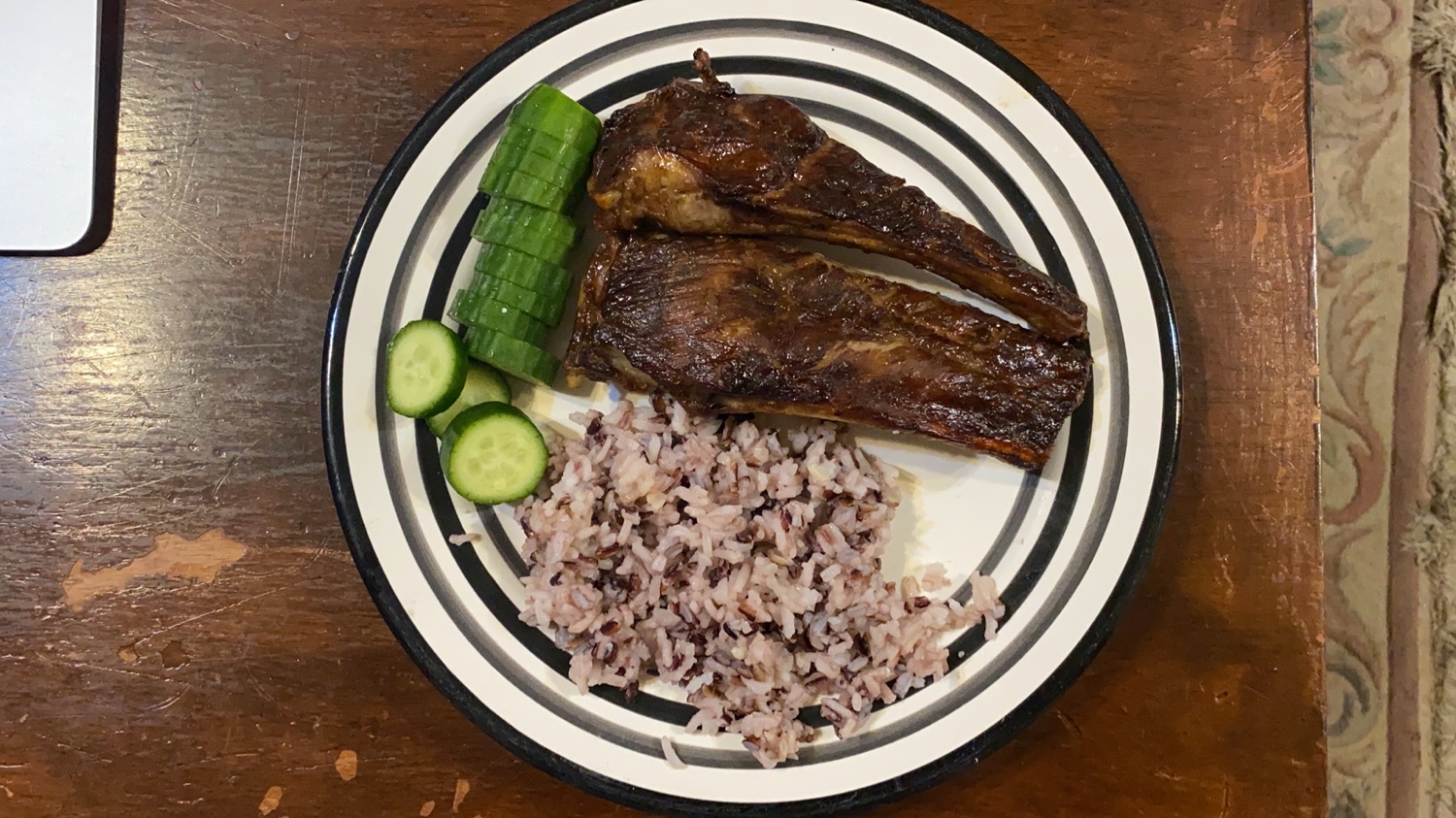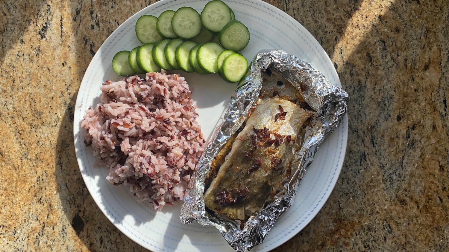 ปลาราดซอสเห็ด + ข้าวขาว&ข้าวไรส์เบอรรี่ + แตงกวา