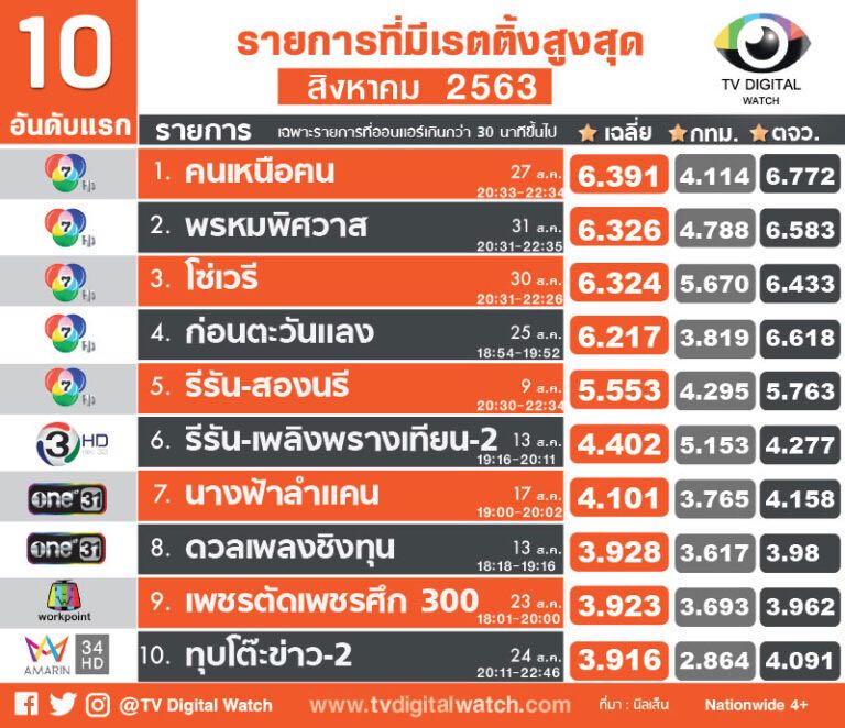 เปิดข้อมูลรายการเรตติ้งสูงสุดเดือน ส.ค.63