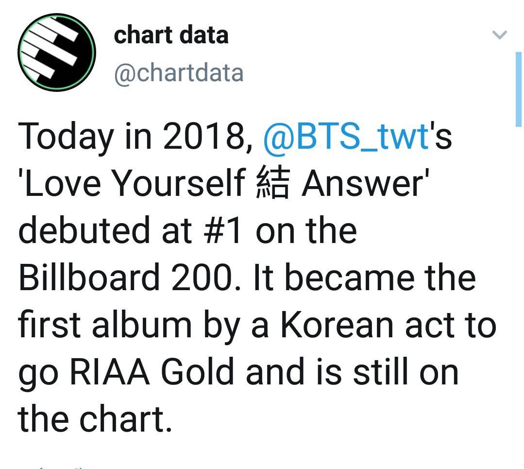 วันนี้ในปี 2018 อัลบั้ม Love Yourself 結 Answer' เดบิวต์อันดับ1 Billboard Hot 200