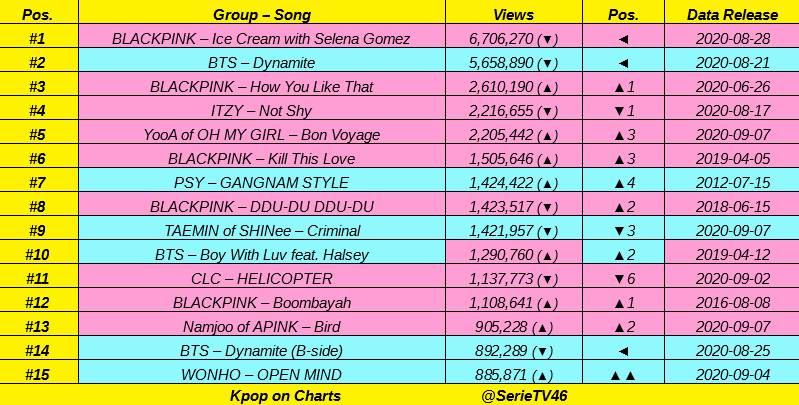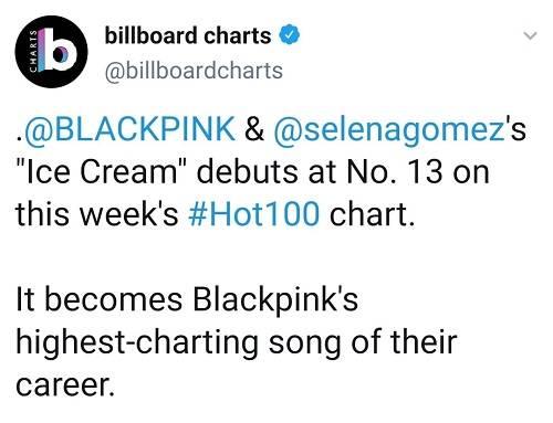 On September 8th, Billboard announced on Twitter that BLACKPINK's "Ice Cream" with Selena Gomez came in at rank 13 charting at their best since their debut.