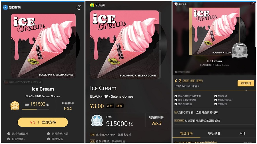 " นอกจากยอดขาย Digital Singles แล้ว BLACKPINK ยังสามารถขึ้นอันดับ 1 ชาร์ต MV Overall บน QQ Music ได้ทั้ง 2 เพลง ซึ่งปัจจุบัน 'Ice Cream' ยังคงอยู่อันดับ 1 บนชาร์ตรายวัน และ 'How You Like That' ในอันดับ 3 "
