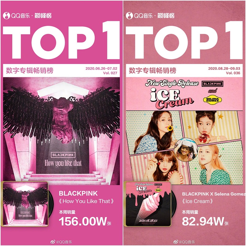 " BLACKPINK มียอดขาย Digital Singles ในประเทศจีนผ่าน 4,000,000 copies โดยทั้งหมดมาจาก 2 Digital Singles เพลงใหม่ในปี 2020 เท่านั้น (How You Like That และ Ice Cream) "