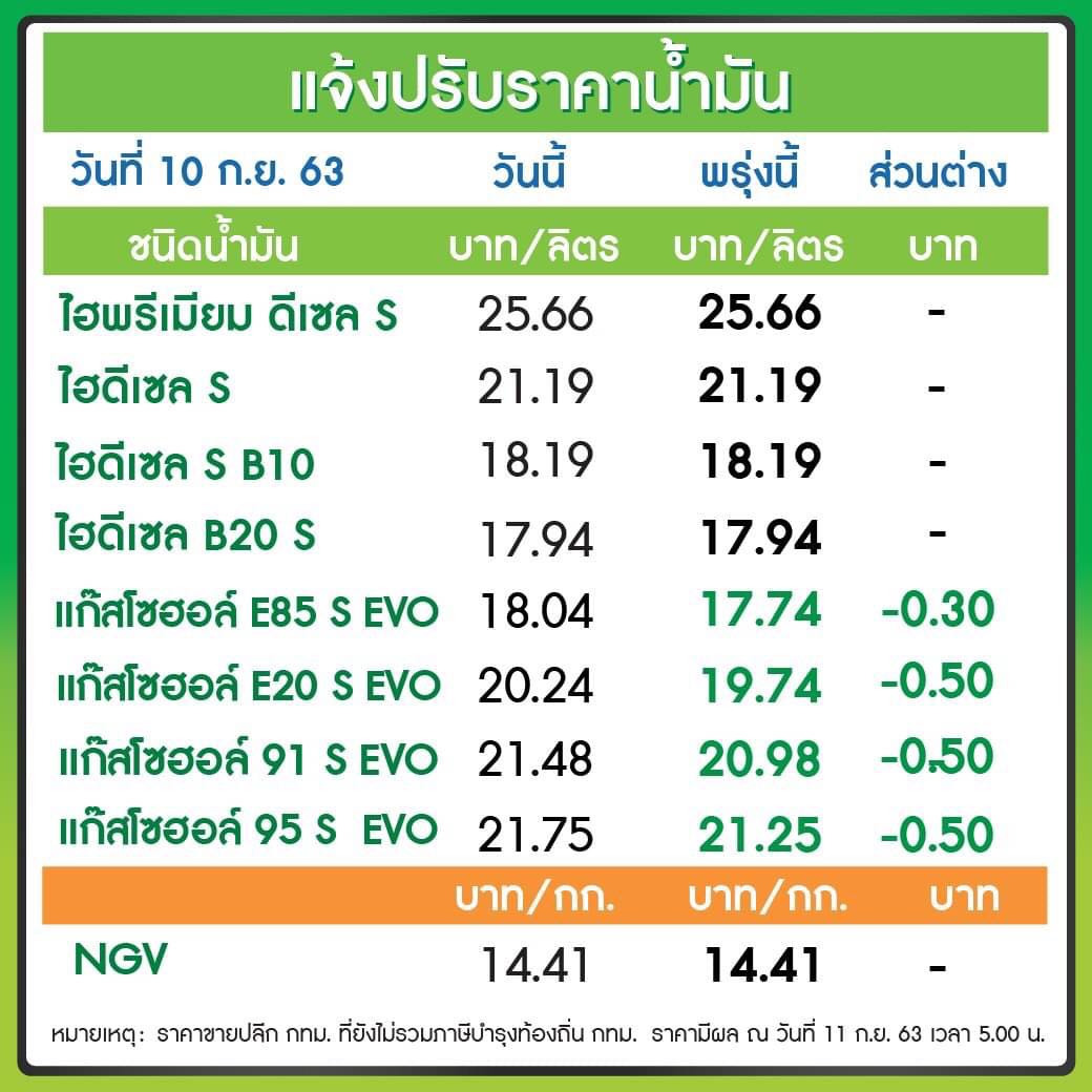 โดยน้ำมันกลุ่มเบนซินและแก๊สโซฮอล์ทุกชนิด ปรับลดลง 50 สตางค์/ลิตร เว้น E85 ปรับลดลง 30 สตางค์/ลิตร ส่วนน้ำมันกลุ่มดีเซลราคาคงเดิม มีผลวันพรุ่งนี้ (11 ก.ย. 2563) ตั้งแต่เวลาตี 5 เป็นต้นไป
