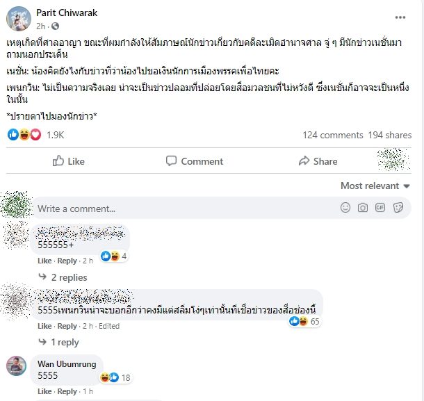 โดยโพสต์ดังกล่าว มี นายวัน อยู่บำรุง ส.ส.กทม. พรรคเพื่อไทย เข้ามาแสดงความคิดเห็น โดยพิมพ์ 555 หัวเราะกับเรื่องดังกล่าวด้วย