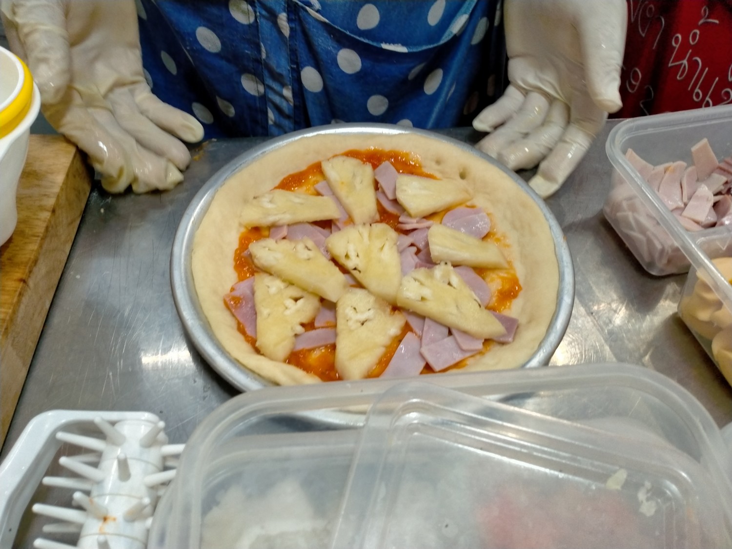 พี่เชฟค่อยๆจัดสัปปะรด แฮม และชีส โปะแต่งหน้า