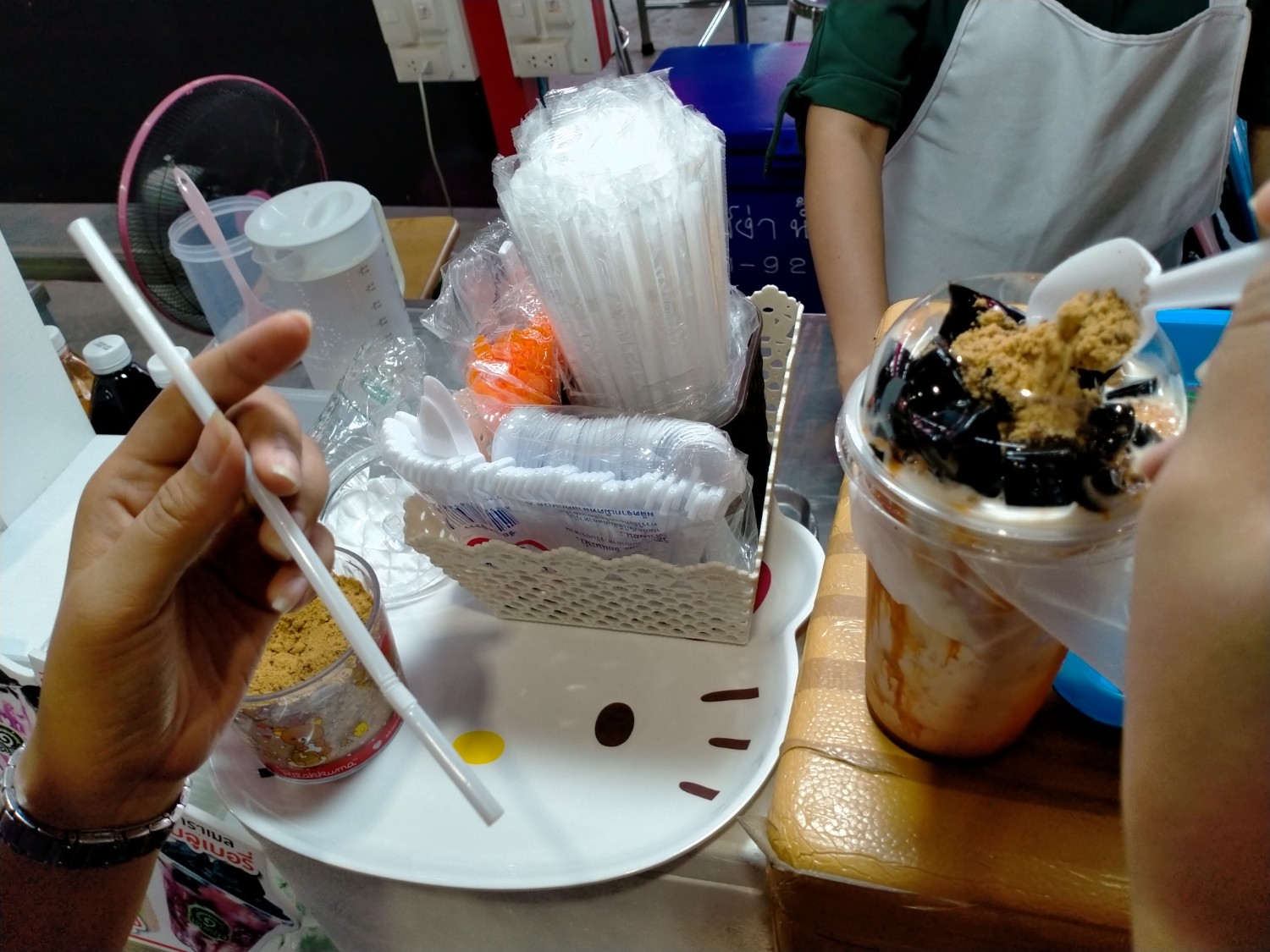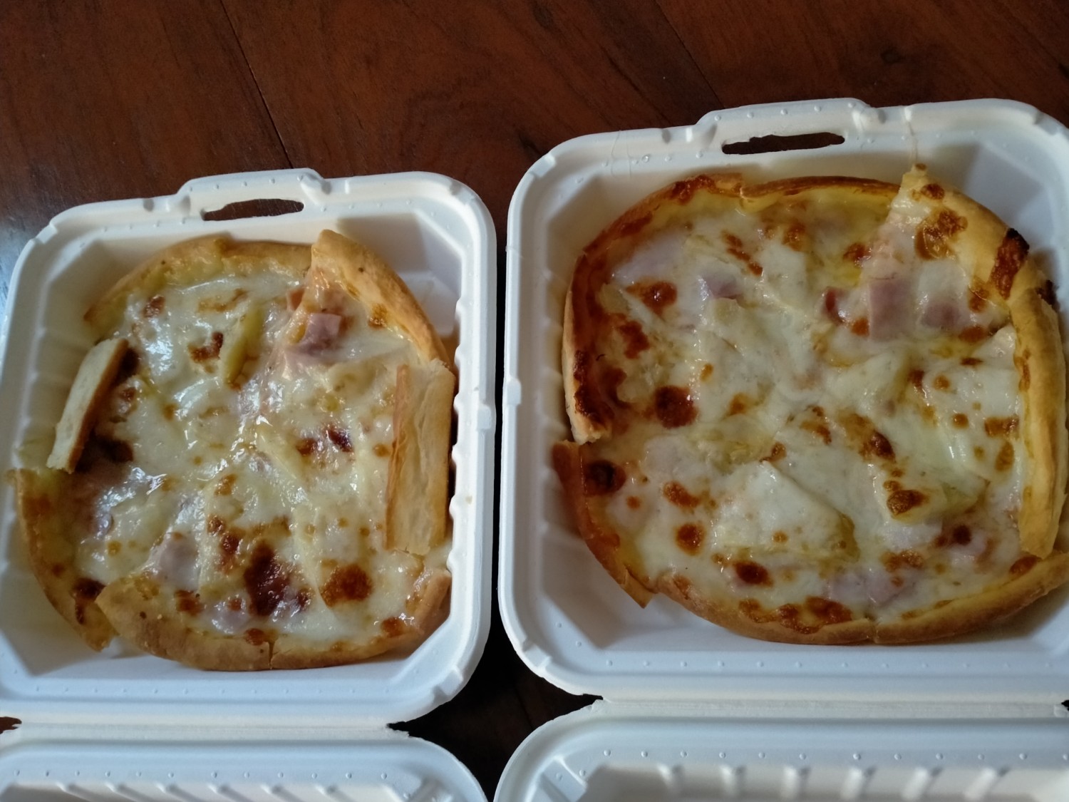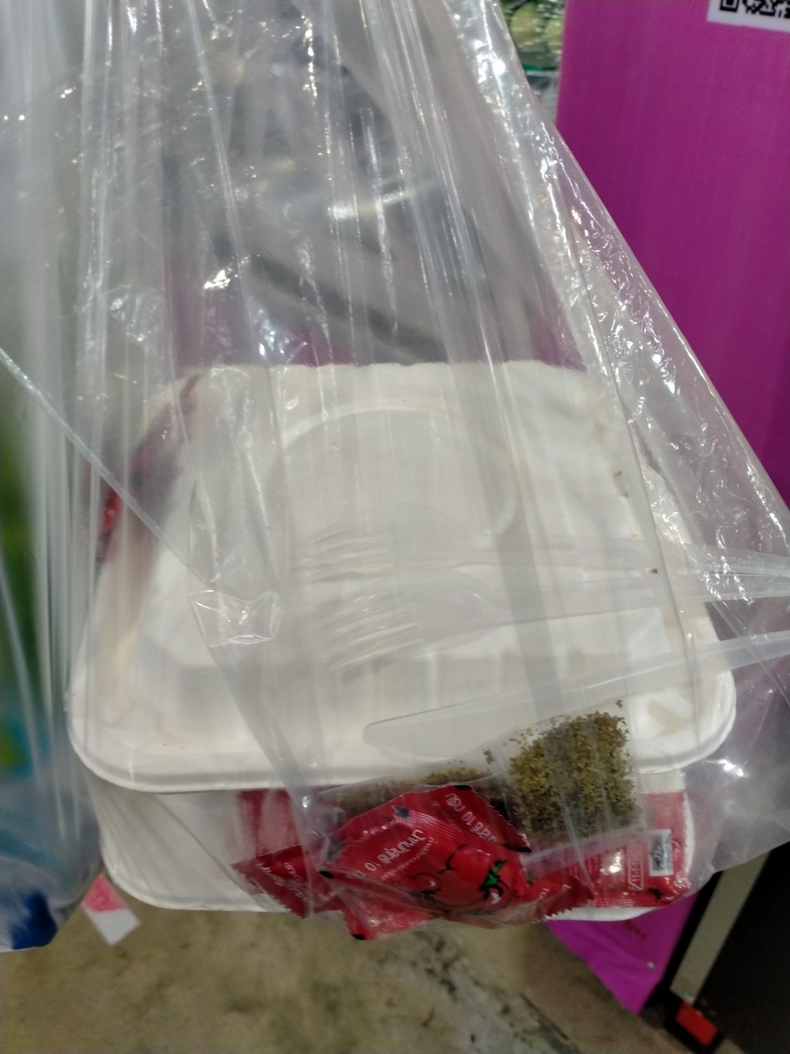 ใส่กล่อง 2 กล่อง หิ้วใส่ถุงฝากบ้านพ่อแม่ผมกล่องนึง มีดส้อม ซอสและอเมริกาโน่ ในถุงกินฟินๆที่บ้านกันไป แต่ถ้าหากอยากกินร้อนๆที่ตลาดก็จะมีโต๊ะเก้าอี้ให้บริการนั่งกินได้เช่นกันครับ