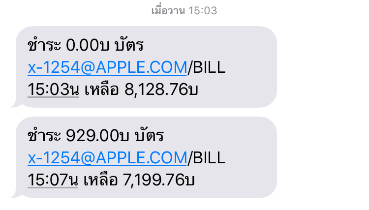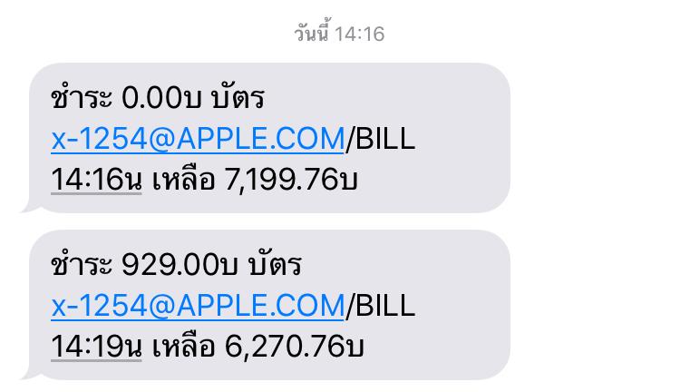 คือเราเชื่อมบัตรไว้กับ Apple ID เว็บของแอปเปิ้ล แล้วเมื่อวานนี้มันมีข้อความ SMS จากธนาคารส่งเข้ามาว่า "ชำระเงิน 780.0บ บาท" จากเว็บของแอปเปิ้ล ซึ่งตอนนั้นเราไม่ได้กดซื้ออะไรเลยอยู่ๆเงินก็โดน