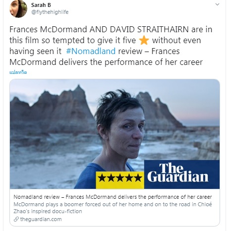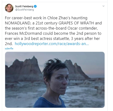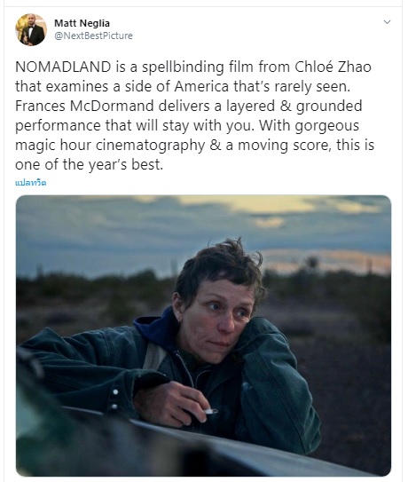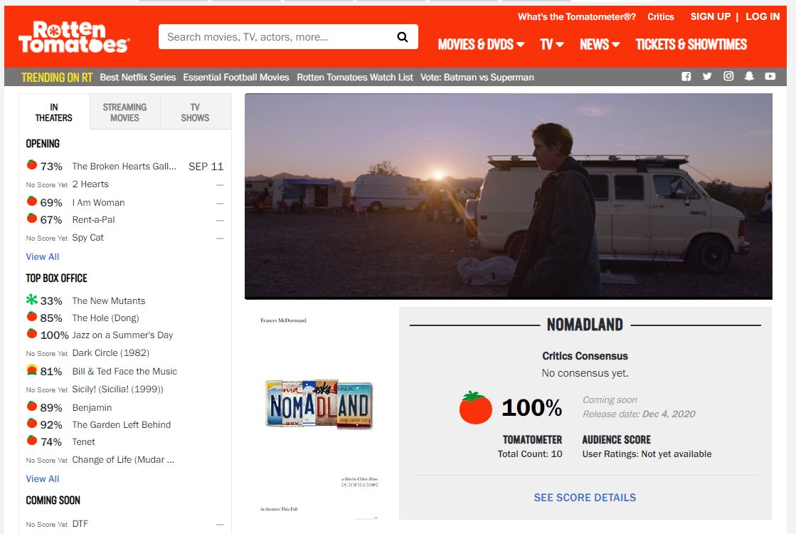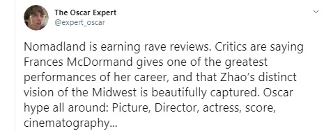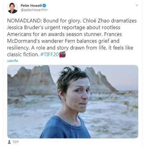 เสร็จสิ้นงานเทศกาลภาพยนตร์นานาชาติเวนิช ครั้งที่ 77 และประกาศผลรางวัลไปเรียบร้อแล้ว ปรากฏว่า "์Nomadland" ภาพยนตร์แนว Road Movie ของผู้กำกับหญิงสัญชาติจีนอย่าง Chloé Zhao คว้ารางวัลใหญ่ Golden Lion ในงานเทศกาลภาพยนตร์นานาชาติเวนิช ครั้งที่ 77ไปได้สำเร็จด้วยคำวิจารณ์ที่ดีอย่างล้นหลาม ซึ่ง 3 ปีก่อนหน้านี้ The Shape of Water, Roma และ Joker ต่างคว้ารางวัลใหญ่ ซึ่งหมายความว่าเรื่องนี้มีสิทธิ์ลุ้นชิงภาพยนตร์ยอดเยี่ยม (Best Picture) ในรางวัล Oscar สูงมาก