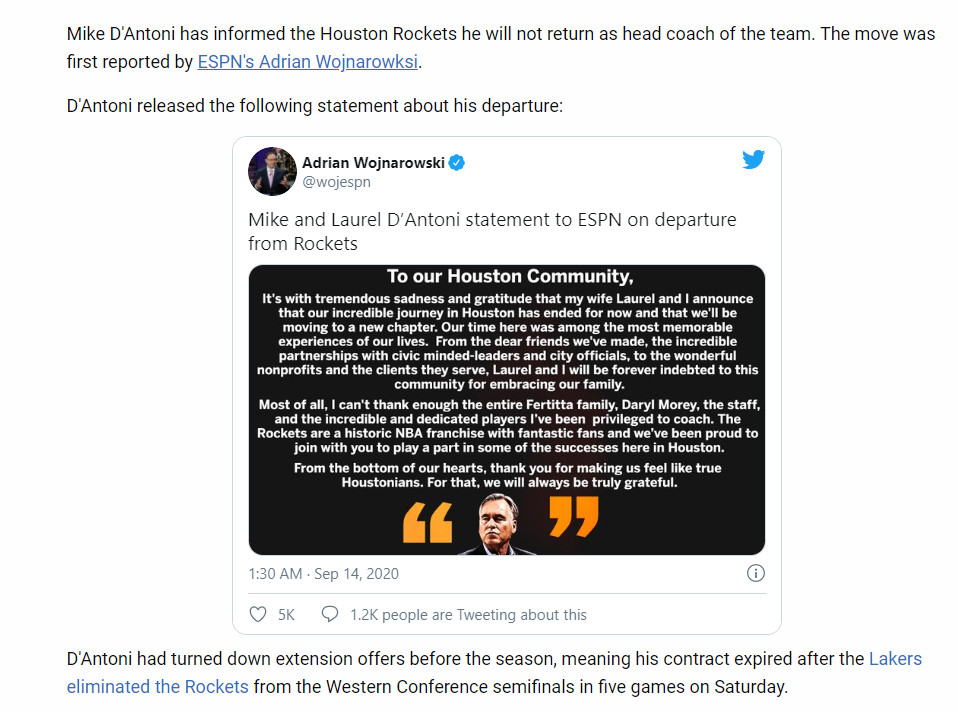 Mike D'Antoni โพสต์กล่าวลา แฟนๆ Rockets หลังจาก แพ้ตกรอบ playoffs รอบ 2