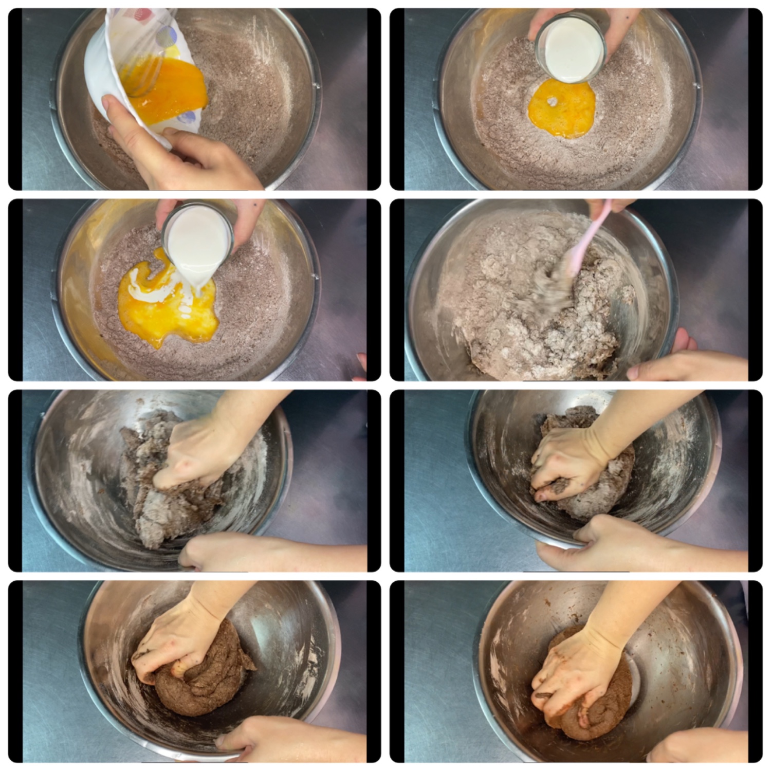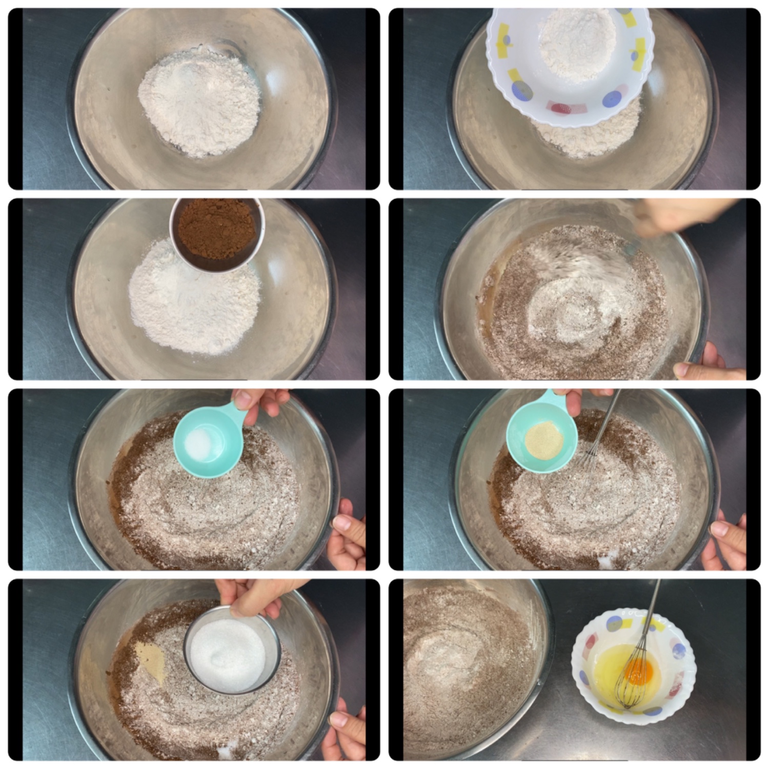 - นำแป้งขนมปัง แป้งเค้ก ยีสต์ ผงโกโก้ น้ำตาล และเกลือ ผสมรวมกัน