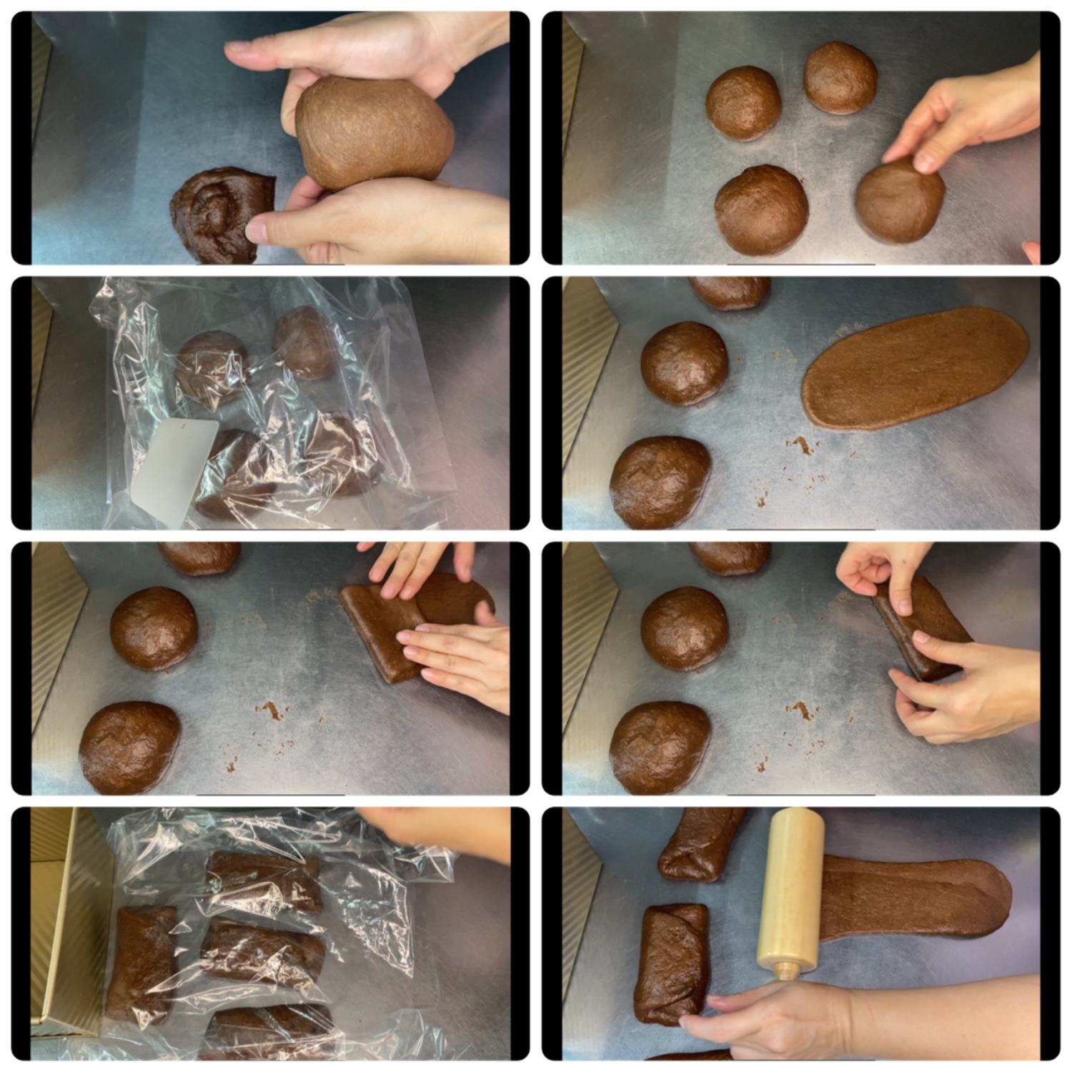 - นำมากลิ้งอีกครั้งเป็นแผ่นยาว แล้วม้วนเป็นแท่ง เรียงลงในพิมพ์ขนมปัง
