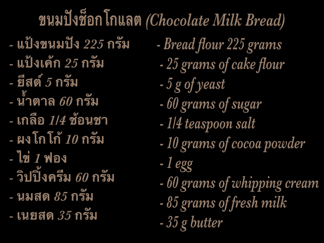 วันนี้จะมาทำขนมปังนวดมือ เนื้อนุ่มๆรสช็อกโกแลตกันค่ะ หรือเราจะเรียกว่าmilk bread ก็ได้ค่ะ จะเป็นขนมแบบสไตล์ขนมปังโลฟแบบญี่ปุ่นคือ เนื้อนุ่มเปลือกบางค่ะ ทานเปล่าๆก็นุ่มอร่อยค่ะ