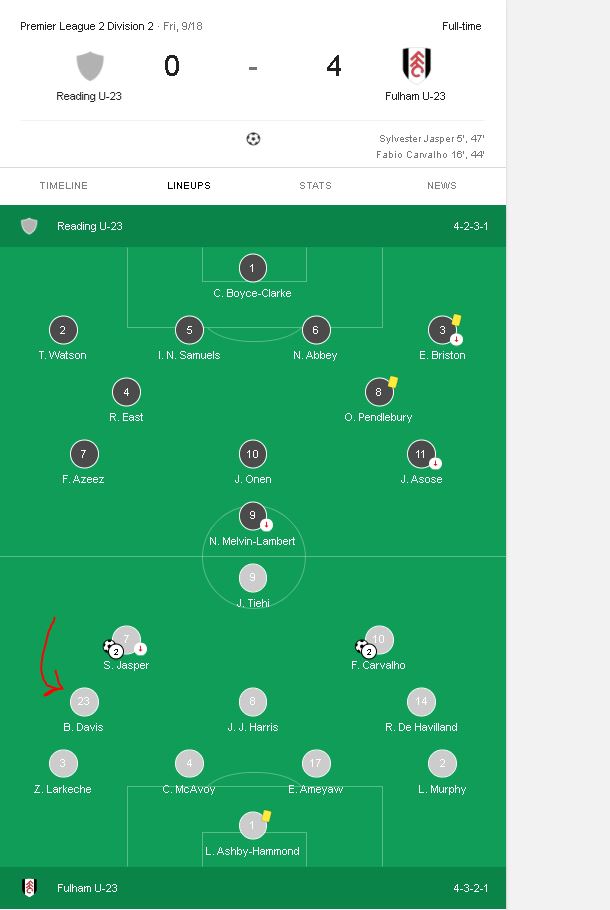เบนเดวิสลงตัวจริงในพรีเมียร์ลีค2(U23) ดิวิชั่น2 เกมช่วยฟูแล่มเอาชนะรีดดิ้ง 4ประตูต่อ0