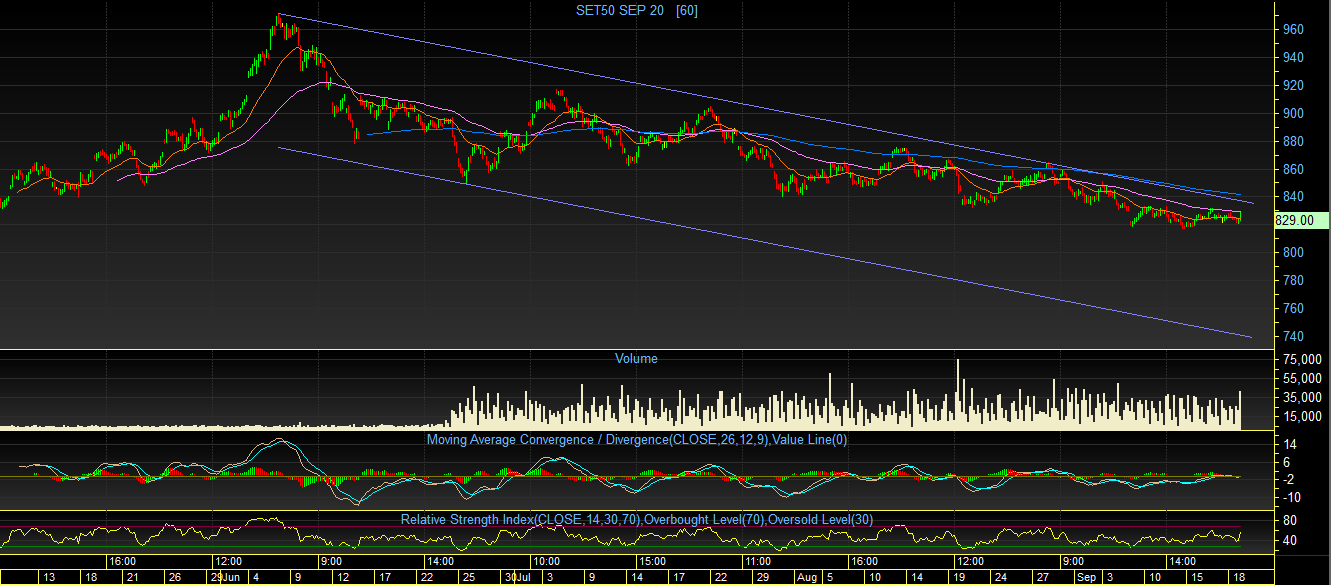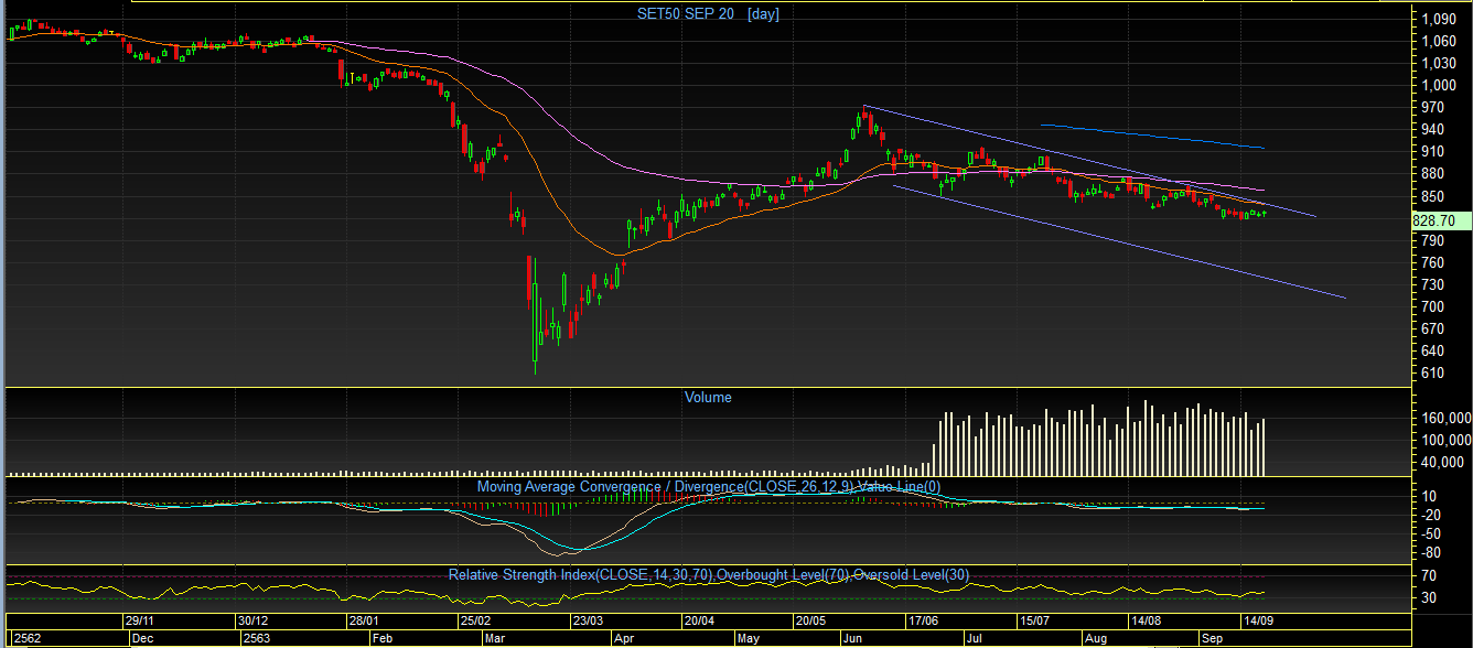 S50U20 TF Day: ตลอดทั้งสัปดาห์ที่ผ่านมา ดัชนียังคงเคลื่อนไหวในลักษณะ Sideways Down ภายในกรอบ “Down trend Channel” ซึ่งยังคงมอว่า ดัชนีจะเคลื่อนไหวภายในกรอบนี้ ต่อไปอีกสักระยะ จนกว่าจะเกิดรูปแบบกลับตัวอย่างมีนัยยะ ทั้งนี้ถ้าหากดัชนีสามารถ Break กรอบแนวต้านบน ณ ระดับ 850 จุด ขึ้นไปได้ ก็จะทำให้ภาพสัญญาณดูดีขึ้น แต่ถ้าหากหลุดแนวรับจิตวิทยา ณ ระดับ 800 จุด ลงมา ก็อาจเกิดการพักฐาน ตามมา
