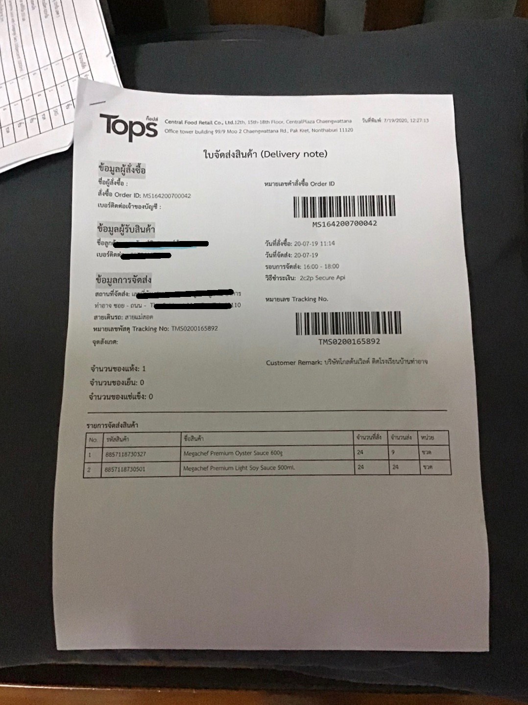 เนื่องจากวันที่ 19/7/2020 ผมทำการสั่งซื้อสินค้าผ่านแอพพลิเคชัน Tops คือซอส Megachef premium oyster sauce 600g จำนวน 24 ขวด เเละ Megachef premium light soy sauce 500 ml. จำนวน 24 ขวด แต่ได้รับจริง เพียง 9 ขวด เเละ 24 ขวด ตามลำดับ ดังรูป