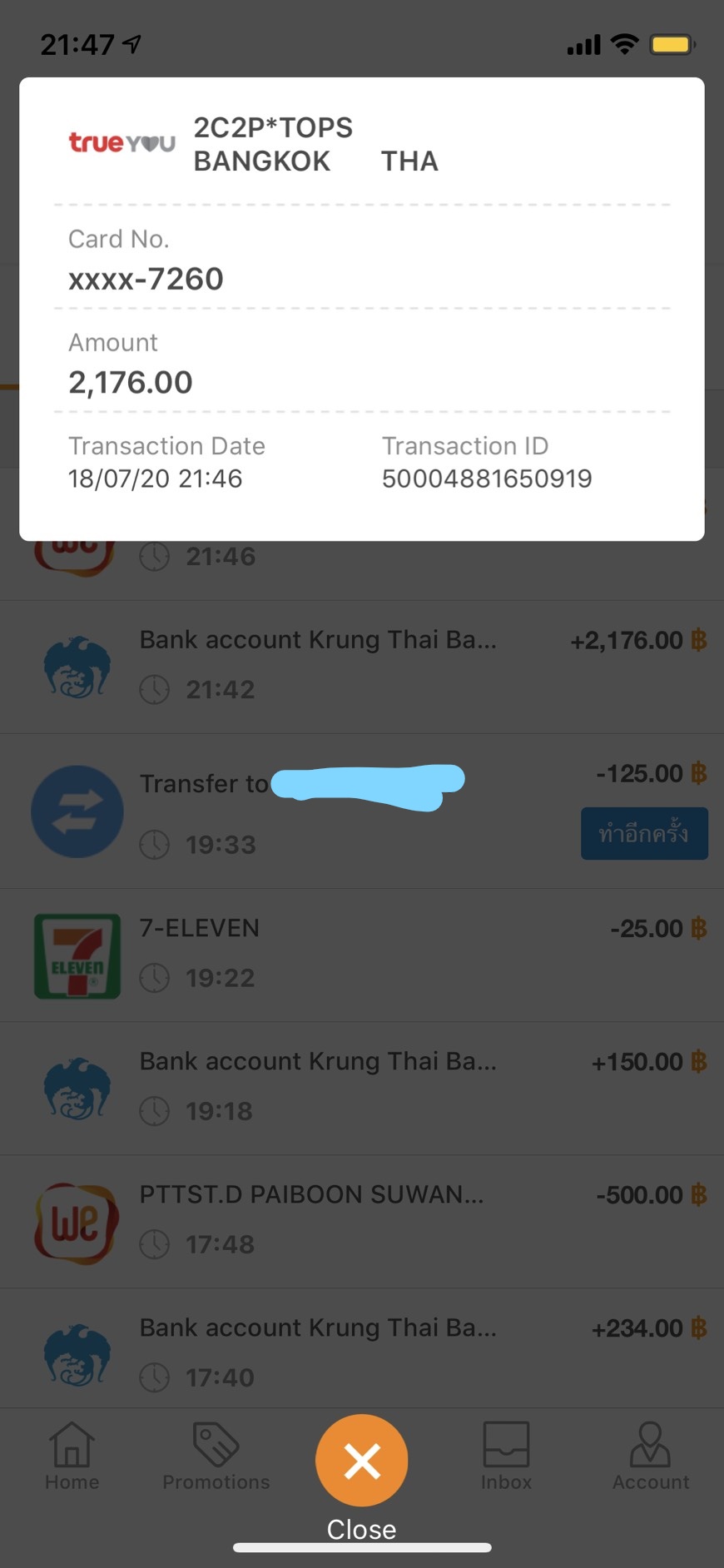 และผมได้ชำระเงินผ่าน บัตร True Digital Card ให้ระบบ 2C2P จำนวน 2,176 บาท ดังรูป