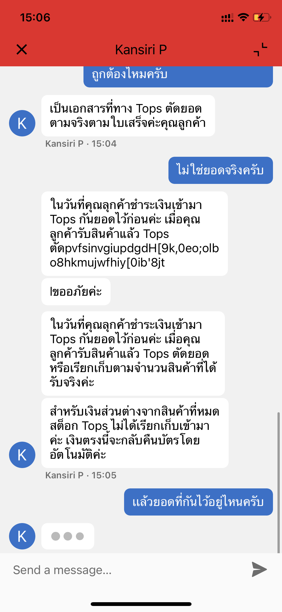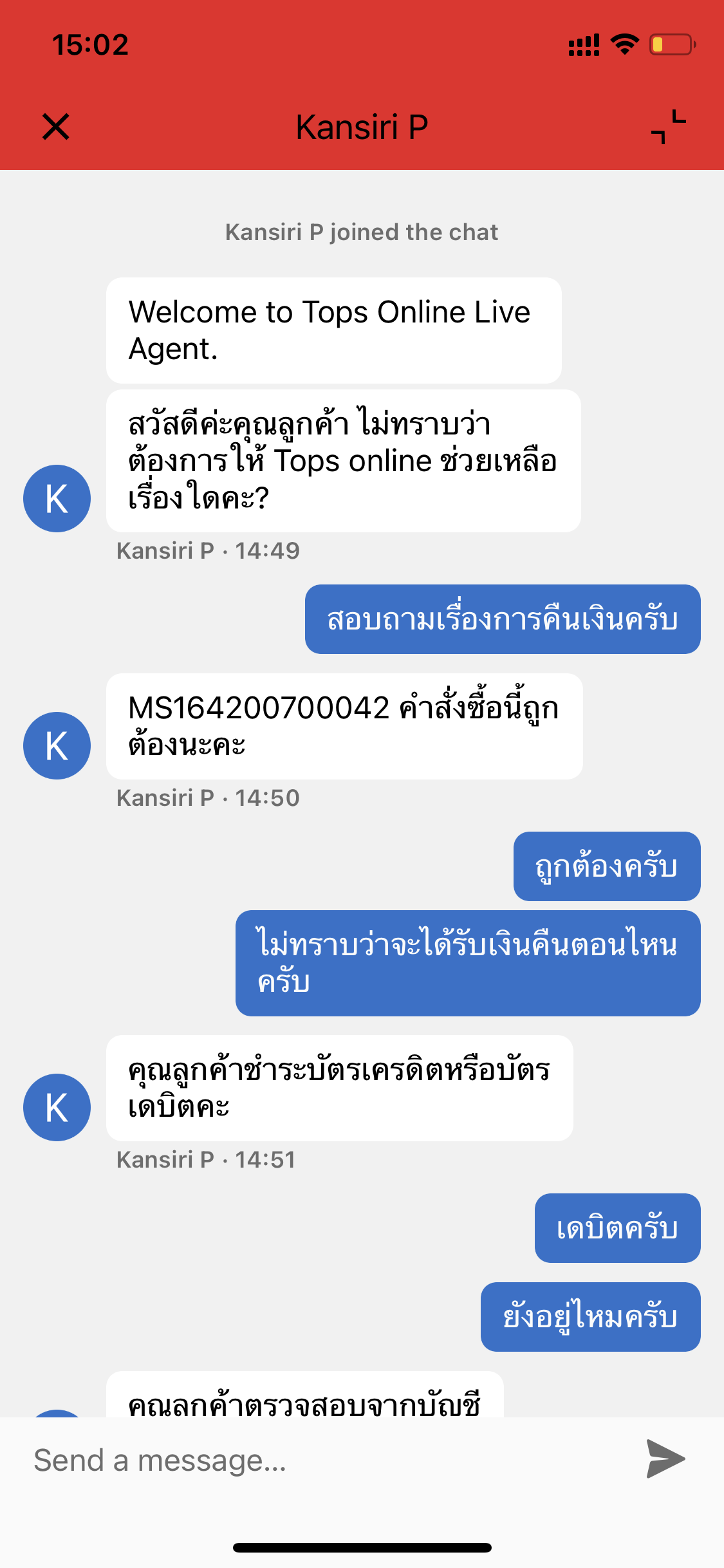 21/9/2020 ก็ยังไม่ได้รับเงินคืน (ผ่านมา 62 วัน) จึงได้ติดต่อกับทางเจ้าหน้าที่ของ Tops อีกรอบ รายละเอียดในรูปเลยครับ