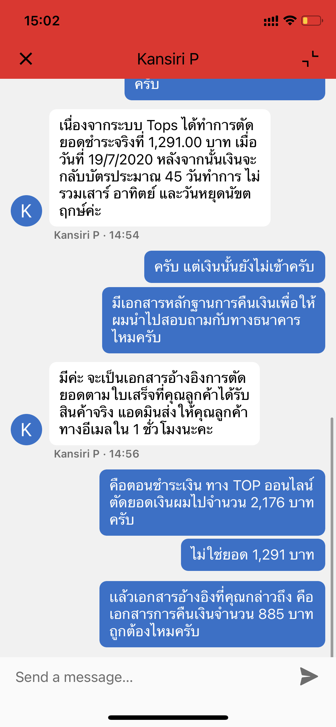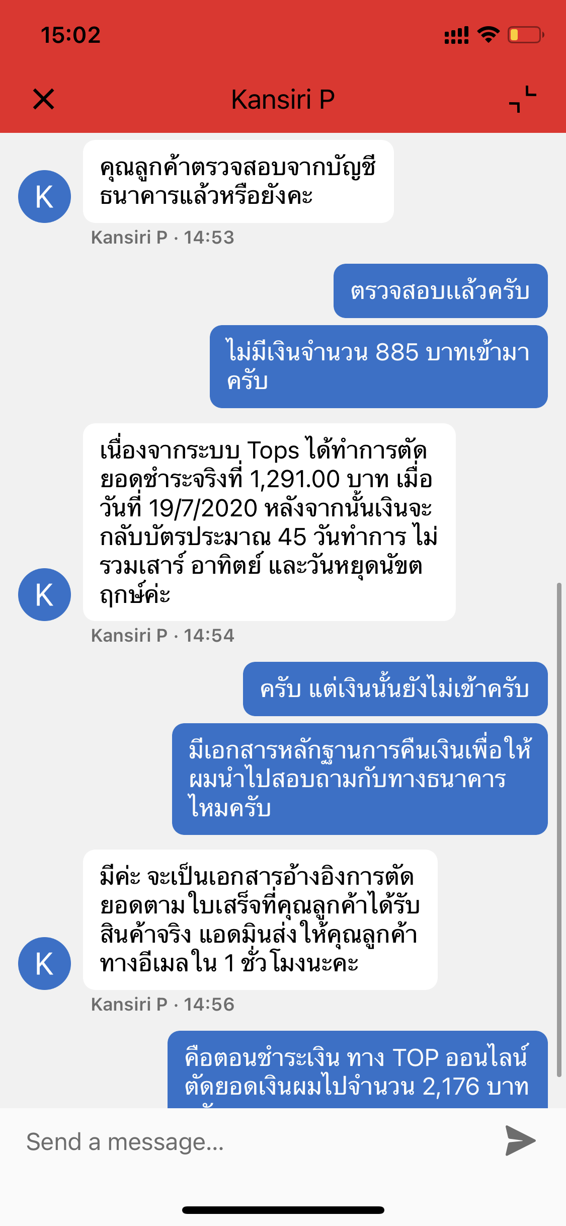 ผมก็รอการคืนเงินจาก Tops จำนวน 885 บาท จนถึงวันนี้ 21/9/2020 ก็ยังไม่ได้รับเงินคืน (ผ่านมา 62 วัน) จึงได้ติดต่อกับทางเจ้าหน้าที่ของ Tops อีกรอบ รายละเอียดในรูปเลยครับ