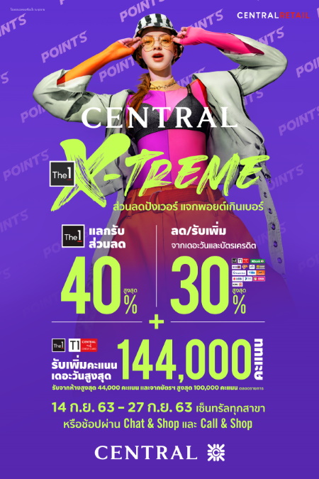 ห้างเซ็นทรัลเอาใจนักช้อปทั้งลดราคา แลกรับส่วนลด คืนคะแนนสะสม ไม่มีกั๊ก จัดโปรฯแรง “CENTRAL The 1 X-TREME”  (เซ็นทรัล เดอะวัน เอ็กซ์ตรีม) ส่วนลดปังเวอร์ แจกพอยต์เกินเบอร์ แลกรับคูปองส่วนลดสูงสุด 40% เมื่อใช้คะแนนเดอะวัน พร้อมลด/รับเพิ่ม สูงสุดอีก 30% จากเดอะวัน และบัตรเครดิตชั้นนำที่ร่วมรายการ ทั้งยังสามารถรับคะแนนเดอะวันเพิ่มสูงสุดถึง 144,000 คะแนน จากห้าง และบัตรเครดิตเซ็นทรัล เดอะวัน เมื่อช้อปครบตามเงื่อนไข พร้อมสิทธิพิเศษอื่น ๆ อีกมากมาย ตั้งแต่วันที่ 14 กันยายน 2563 – 27 กันยายน 2563 ที่ห้างเซ็นทรัลทุกสาขา หรือช้อปผ่าน CENTRAL Chat & Shop ด้วยแอปพลิเคชั่น Line @CENTRALOFFICIAL และ CENTRAL Call & Shop ที่เบอร์ 1425