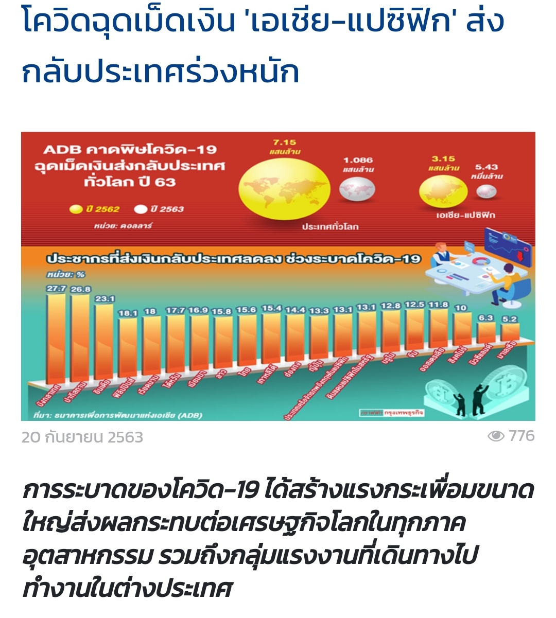 ===โควิดฉุดเม็ดเงิน 'เอเชีย-แปซิฟิก' ส่งกลับประเทศร่วงหนัก ==