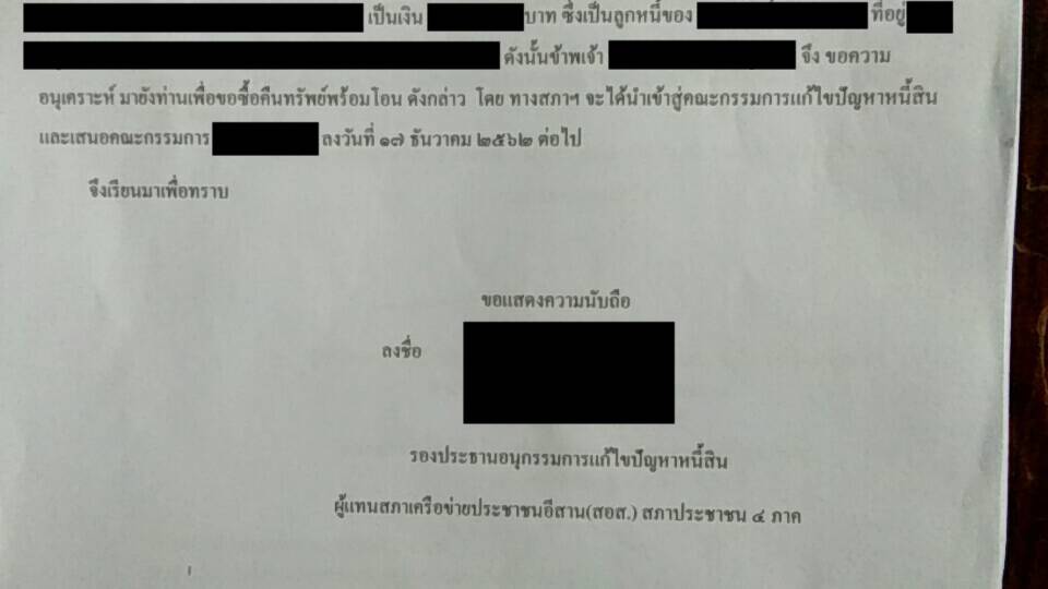 หนังสือจากคณะกรรมการแก้ไขปัญหาหนี้สิน