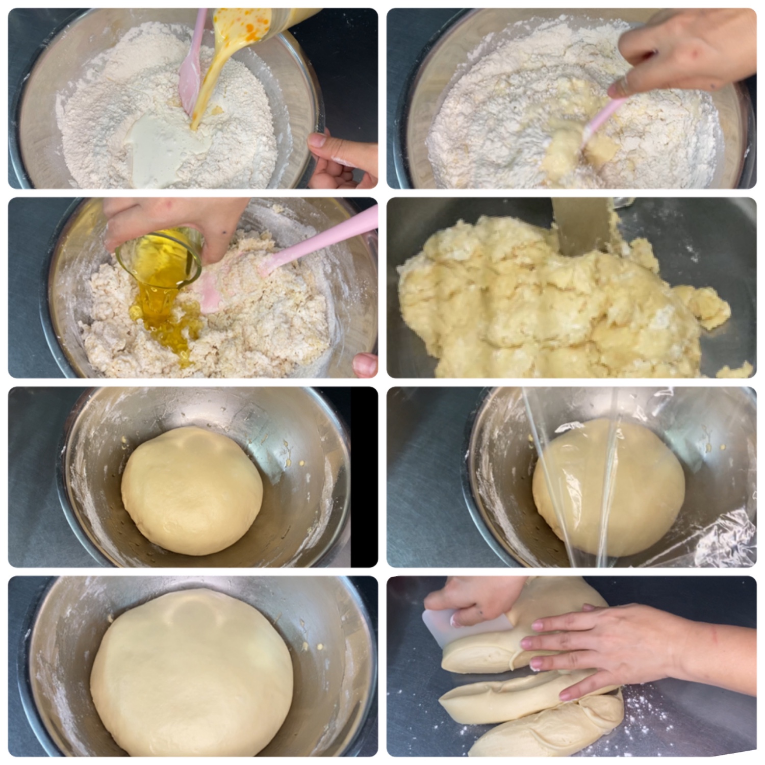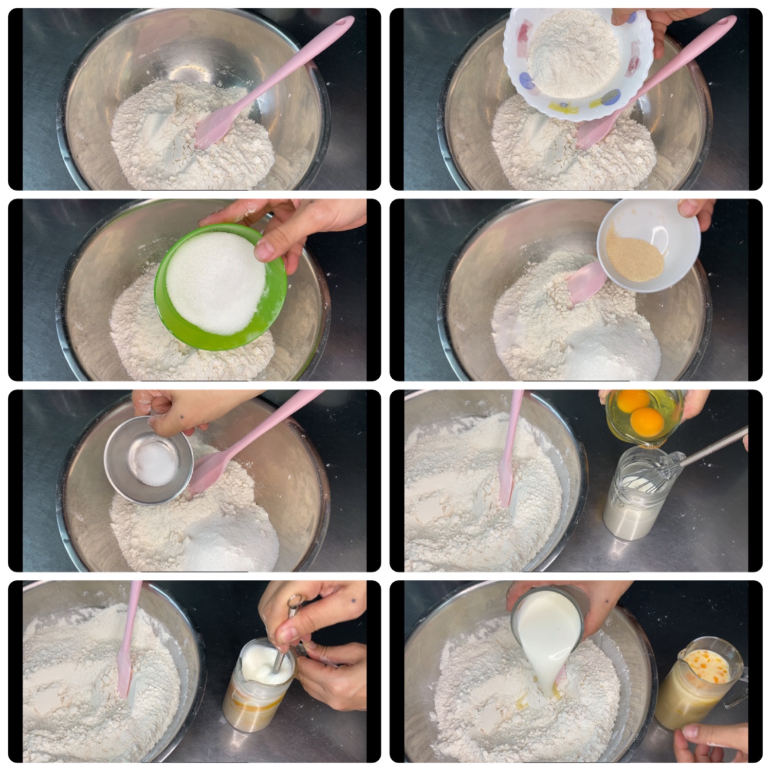 - นำแป้งขนมปัง แป้งเค้ก ยีสต์ น้ำตาล และเกลือผสมรวมกัน และพักไว้