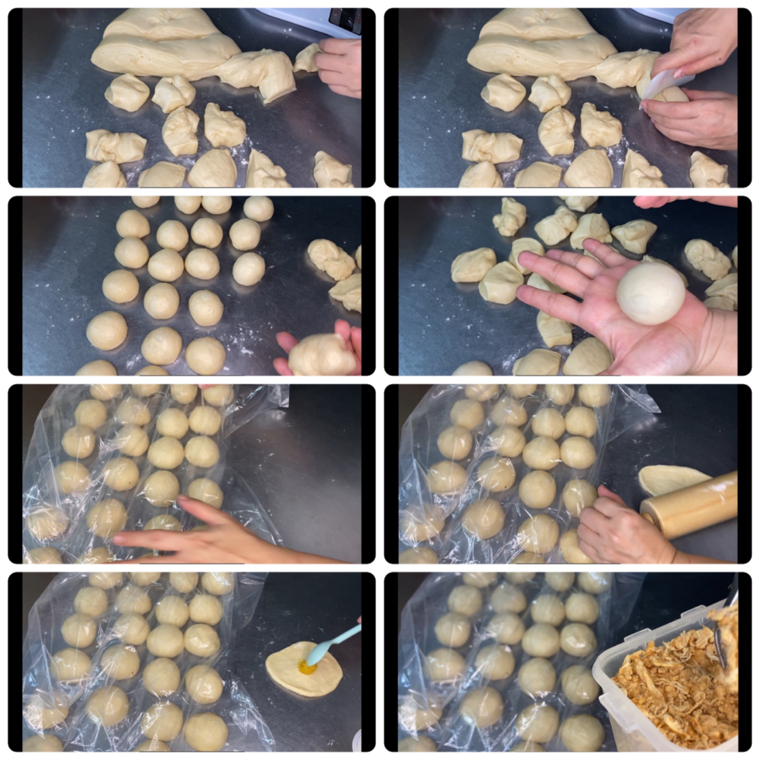 - นำแป้งมากลิ้งเป็นแผ่น แล้วใส่น้ำสลัดลงไป ตามด้วยหมูหยอง ทำการห่อปิดตะเข็บให้เรียบร้อย