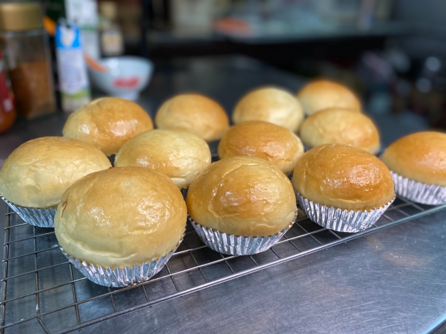 - เมื่อขนมปังสุก นำออกมาทาหน้าขนมด้วยนมข้นจืดเพื่อให้ขนมเงาสวย